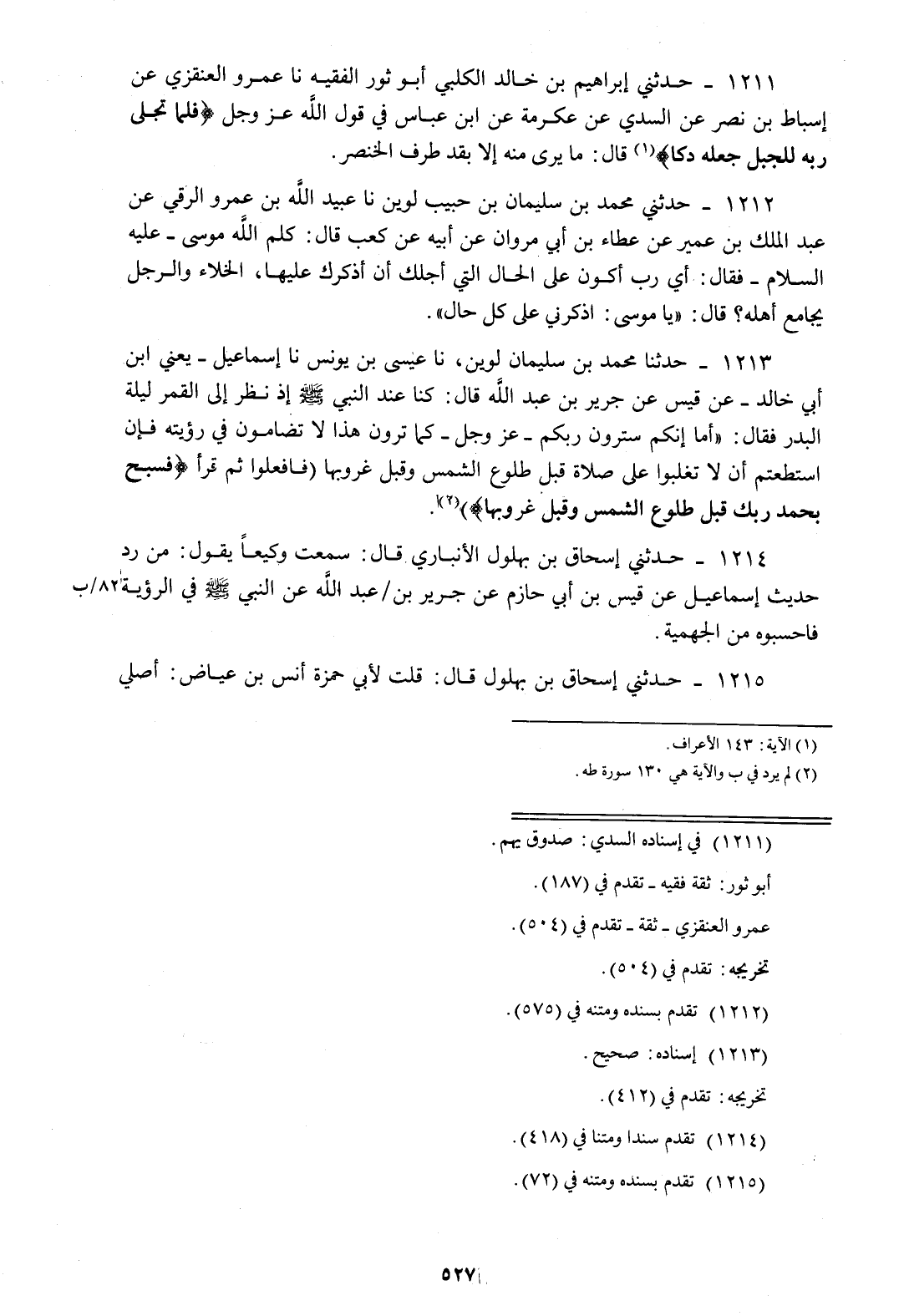 1211 - حَدَّثَنِي إِبْرَاهِيمُ بْنُ خَالِدٍ الْكَلْبِيُّ أَبُو ثَوْرٍ الْفَقِيهُ، نا عَمْرٌو الْعَنْقَزِيُّ، عَنْ أَسْبَاطِ بْنِ نَصْرٍ، عَنِ السُّدِّيِّ، عَنْ عِكْرِمَةَ، عَنِ ابْنِ عَبَّاسٍ، فِي قَوْلِ اللَّهِ عَزَّ وَجَلَّ {§فَلَمَّا تَجَلَّى رَبُّهُ لِلْجَبَلِ جَعَلَهُ دَكًّا} [الأعراف: 143] قَالَ: «مَا يُرَى مِنْهُ إِلَّا بِقَدْرِ طَرْفِ الْخِنْصَرِ»