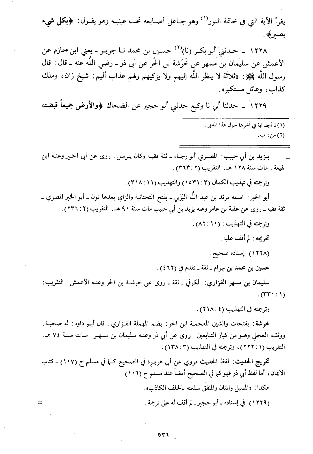 1228 - حَدَّثَنِي أَبُو بَكْرٍ، نا حُسَيْنُ بْنُ مُحَمَّدٍ، نا جَرِيرٌ يَعْنِي ابْنَ حَازِمٍ، عَنِ الْأَعْمَشِ، عَنْ سُلَيْمَانَ بْنِ مُسْهِرٍ، عَنْ خَرَشَةَ بْنِ الْحُرِّ، عَنْ أَبِي ذَرٍّ رَضِيَ اللَّهُ عَنْهُ قَالَ: قَالَ رَسُولُ اللَّهِ صَلَّى اللهُ عَلَيْهِ وَسَلَّمَ: " §ثَلَاثَةٌ لَا يَنْظُرُ اللَّهُ إِلَيْهِمْ وَلَا يُزَكِّيهِمْ وَلَهُمْ عَذَابٌ أَلِيمٌ: شَيْخٌ زَانٍ وَمَلِكٌ كَذَّابٌ وَعَائِلٌ مُسْتَكْبِرٌ "