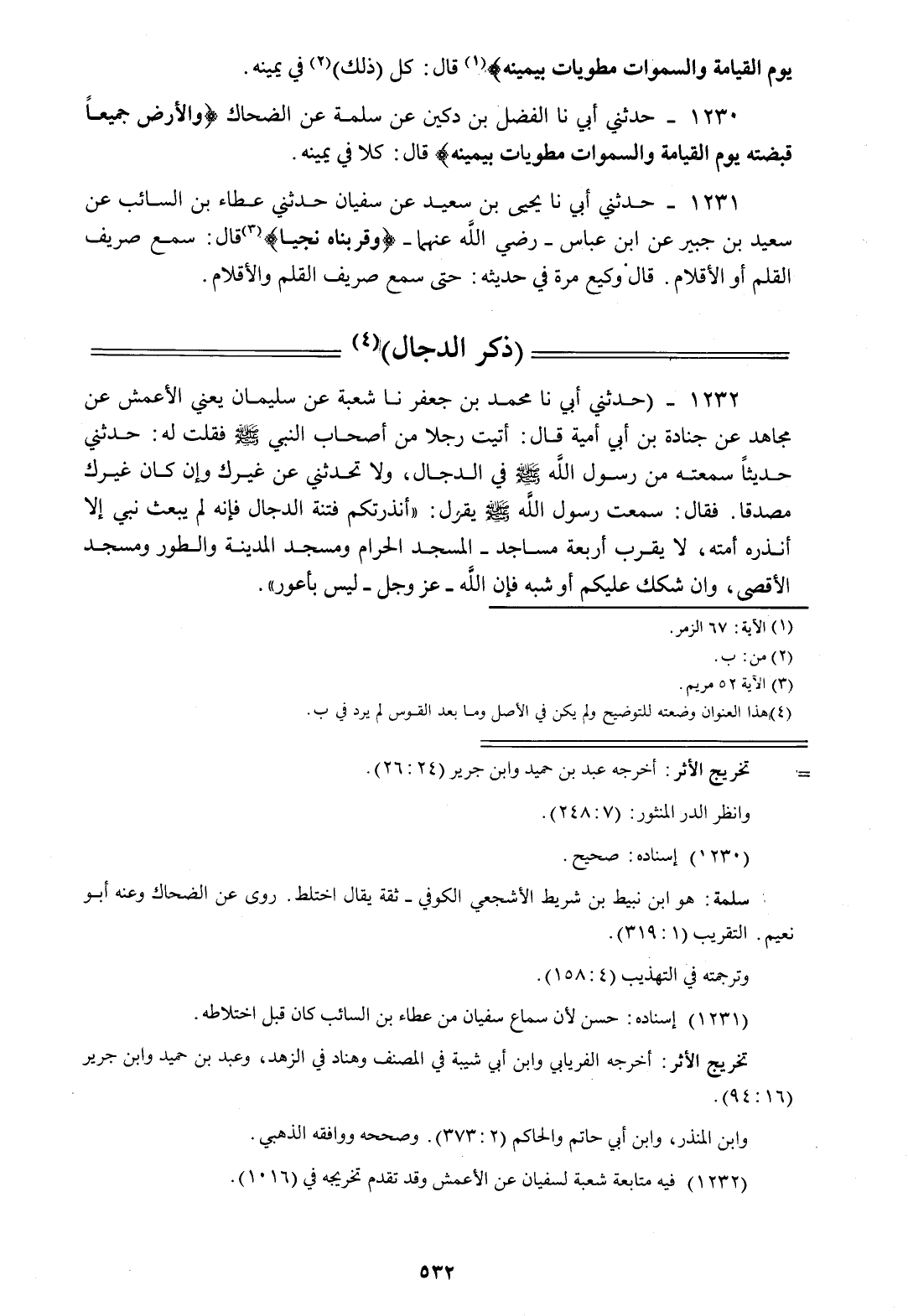 1230 - حَدَّثَنِي أَبِي، نا الْفَضْلُ بْنُ دُكَيْنٍ، عَنْ سَلَمَةَ، عَنِ الضَّحَّاكِ، {§وَالْأَرْضُ جَمِيعًا قَبْضَتُهُ يَوْمَ الْقِيَامَةِ وَالسَّمَاوَاتُ مَطْوِيَّاتٌ بِيَمِينِهِ} [الزمر: 67] قَالَ: «كُلٌّ فِي يَمِينِهِ»