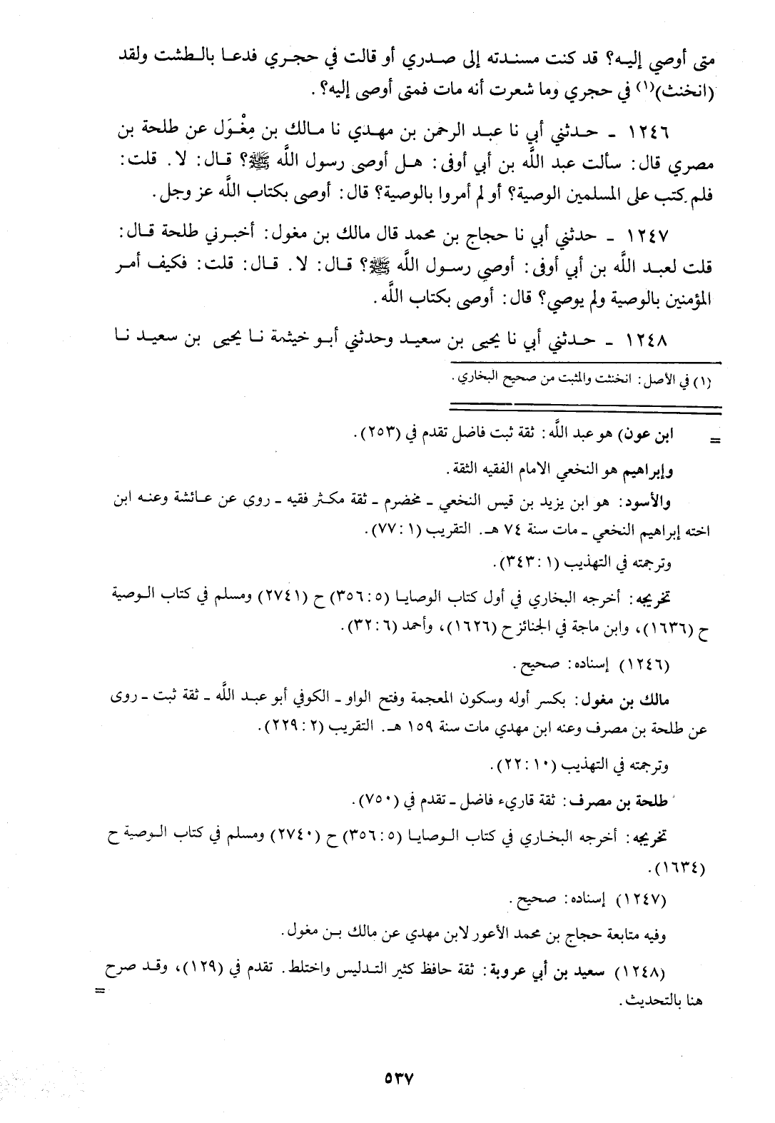 1246 - حَدَّثَنِي أَبِي، نا عَبْدُ الرَّحْمَنِ بْنُ مَهْدِيٍّ، نا مَالِكُ بْنُ مِغْوَلٍ، عَنْ طَلْحَةَ بْنِ مصرف، قَالَ: سَأَلْتُ عَبْدَ اللَّهِ بْنَ أَبِي أَوْفَى: §هَلْ أَوْصَى رَسُولُ اللَّهِ صَلَّى اللهُ عَلَيْهِ وَسَلَّمَ؟ قَالَ: «لَا». قُلْتُ: فَلِمَ كُتِبَ عَلَى الْمُسْلِمِينَ الْوَصِيَّةُ أَوْ لِمَ أُمِرُوا بِالْوَصِيَّةِ؟ قَالَ: «أَوْصَى بِكِتَابِ اللَّهِ عَزَّ وَجَلَّ»