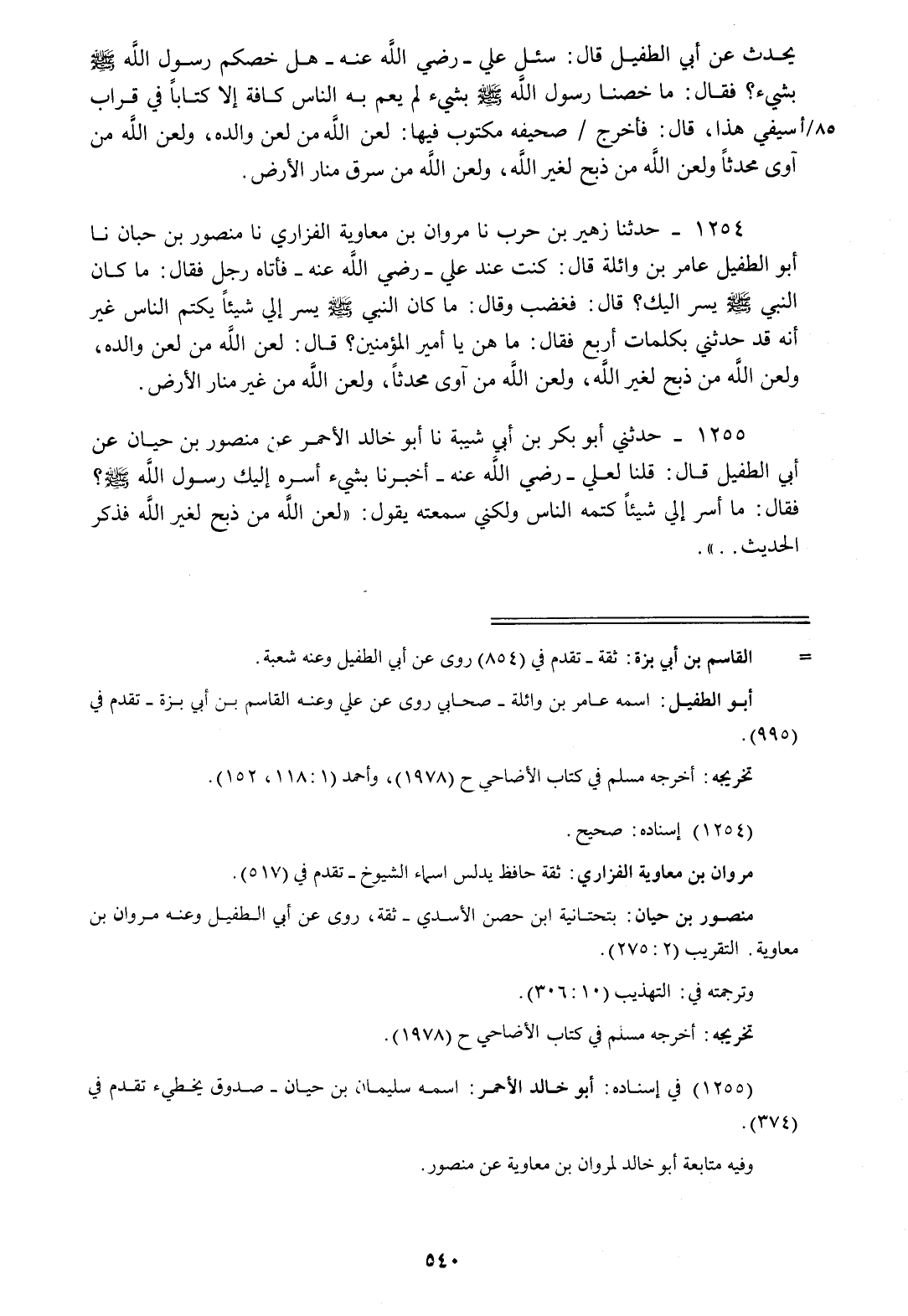 1254 - حَدَّثَنَا زُهَيْرُ بْنُ حَرْبٍ، نا مَرْوَانُ بْنُ مُعَاوِيَةَ الْفَزَارِيُّ، نا مَنْصُورُ بْنُ حِبَّانَ، نا أَبُو الطُّفَيْلِ عَامِرُ بْنُ وَائِلَةَ قَالَ: كُنْتُ عِنْدَ عَلِيٍّ رَضِيَ اللَّهُ عَنْهُ فَأَتَاهُ رَجُلٌ فَقَالَ: مَا كَانَ النَّبِيُّ صَلَّى اللهُ عَلَيْهِ وَسَلَّمَ؟ يُسِرُّ إِلَيْكَ؟ قَالَ: فَغَضِبَ وَقَالَ: مَا كَانَ النَّبِيُّ صَلَّى اللَّه عَلَيْهِ وَسَلَّمَ يُسِرُّ إِلَيَّ شَيْئًا يَكْتُمُ النَّاسَ غَيْرَ أَنَّهُ قَدْ حَدَّثَنِي بِكَلِمَاتٍ أَرْبَعٍ فَقَالَ: مَا هُنَّ يَا أَمِيرَ الْمُؤْمِنِينَ؟ قَالَ: «§لَعَنَ اللَّهُ مَنْ لَعَنَ وَالِدَهُ، وَلَعَنَ اللَّهُ مَنْ ذَبَحَ لِغَيْرِ اللَّهِ وَلَعَنَ اللَّهُ مَنْ آوَى مُحْدِثًا وَلَعَنَ اللَّهُ مَنْ غَيَّرَ مَنَارَ الْأَرْضِ»