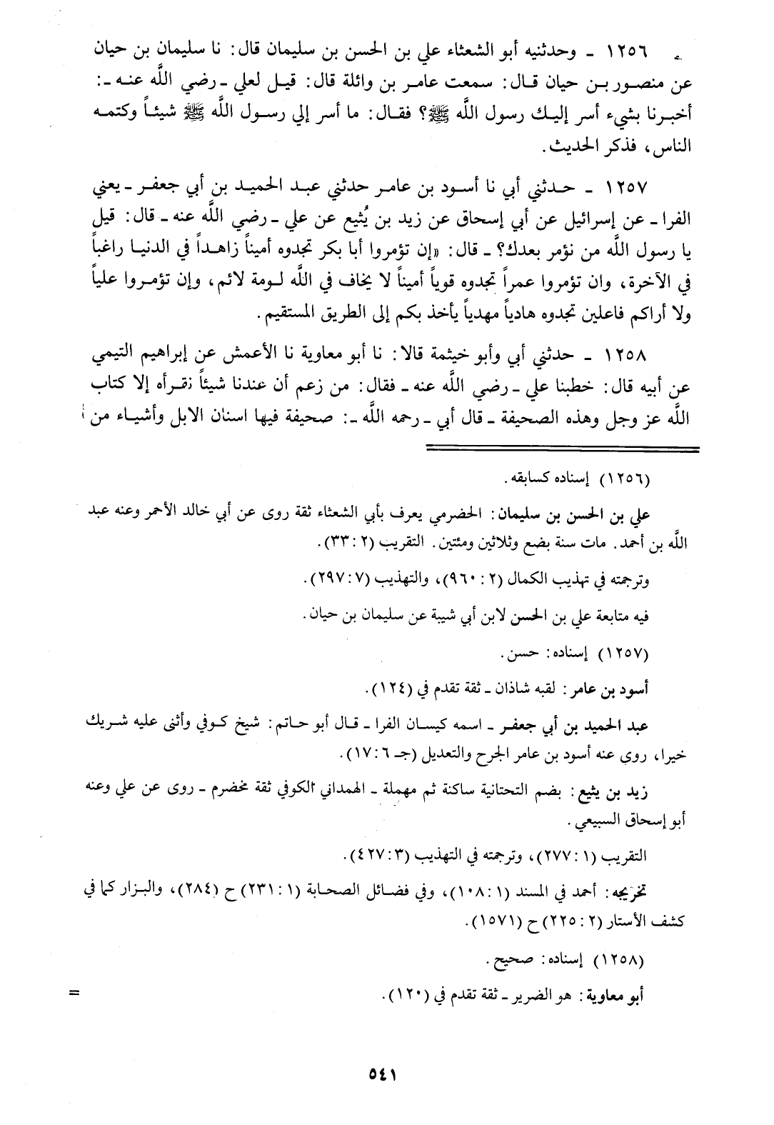 1258 - حَدَّثَنِي أَبِي وَأَبُو خَيْثَمَةَ قَالَا: نا أَبُو مُعَاوِيَةَ، نا الْأَعْمَشُ، عَنْ إِبْرَاهِيمَ التَّيْمِيِّ، عَنْ أَبِيهِ، قَالَ: خَطَبَنَا عَلِيٌّ رَضِيَ اللَّهُ عَنْهُ فَقَالَ §مَنْ زَعَمَ أَنَّ عِنْدَنَا شَيْئًا نَقْرَؤُهُ إِلَّا كِتَابَ اللَّهِ عَزَّ وَجَلَّ وَهَذِهِ الصَّحِيفَةَ " قَالَ أَبِي رَحِمَهُ اللَّهُ: صَحِيفَةٌ فِيهَا أَسْنَانُ الْإِبِلِ وَأَشْيَاءُ مِنَ -[542]- الْجِرَاحَاتِ «فَقَدْ كَذَبَ». قَالَ: وَفِيهَا قَالَ رَسُولُ اللَّهِ صَلَّى اللهُ عَلَيْهِ وَسَلَّمَ: «الْمَدِينَةُ حَرَمٌ مَا بَيْنَ عِيرٍ إِلَى ثَوْرٍ مَنْ أَحْدَثَ فِيهَا حَدَثًا أَوْ آوَى فِيهَا مُحْدِثًا فَعَلَيْهِ لَعْنَةُ اللَّهِ وَالْمَلَائِكَةِ وَالنَّاسِ أَجْمَعِينَ، لَا يَقْبَلُ اللَّهُ عَزَّ وَجَلَّ مِنْهُ يَوْمَ الْقِيَامَةِ صَرْفًا وَلَا عَدْلًا، وَذِمَّةُ الْمُسْلِمِينَ وَاحِدَةٌ يَسْعَى بِهَا أَدْنَاهُمْ» وَزَادَ أَبِي فِي حَدِيثِهِ: «وَمَنِ ادَّعَى إِلَى غَيْرِ أَبِيهِ أَوْ تَوَلَّى غَيْرَ مَوَالِيهِ فَعَلَيْهِ لَعْنَةُ اللَّهِ وَالْمَلَائِكَةِ وَالنَّاسِ أَجْمَعِينَ، لَا يَقْبَلُ اللَّهُ يَوْمَ الْقِيَامَةِ مِنْهُ عَدْلًا وَلَا صَرْفًا»