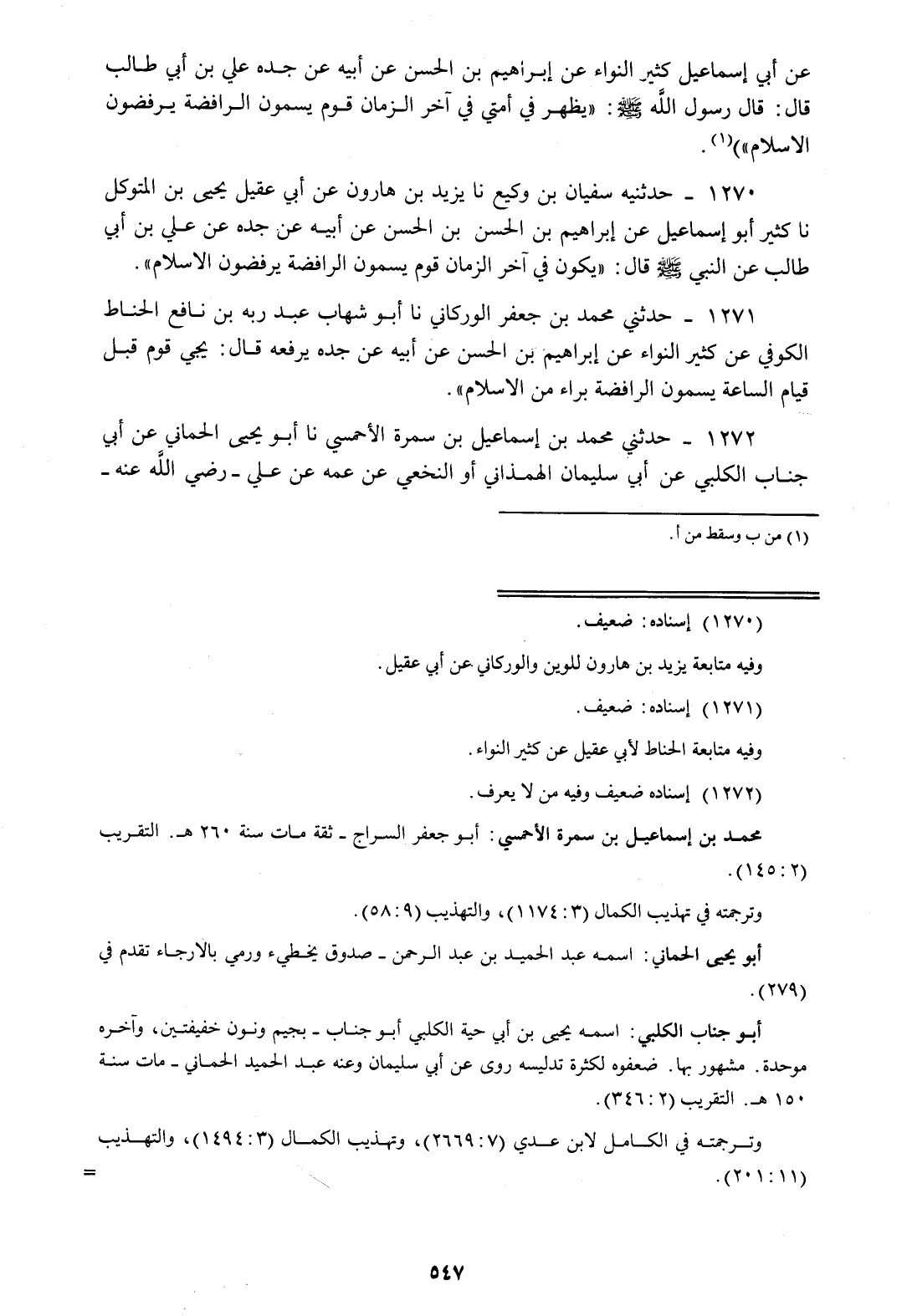 1270 - حَدَّثَنِيهِ سُفْيَانُ بْنُ وَكِيعٍ، نا يَزِيدُ بْنُ هَارُونَ، عَنْ أَبِي عَقِيلٍ يَحْيَى بْنِ الْمُتَوَكِّلِ نا كَثِيرٌ أَبُو إِسْمَاعِيلَ، عَنْ إِبْرَاهِيمَ بْنِ الْحَسَنِ بْنِ الْحَسَنِ، عَنْ أَبِيهِ، عَنْ جَدِّهِ، عَنْ عَلِيِّ بْنِ أَبِي طَالِبٍ، عَنِ النَّبِيِّ صَلَّى اللهُ عَلَيْهِ وَسَلَّمَ قَالَ: «§يَكُونُ فِي آخِرِ الزَّمَانِ قَوْمٌ يُسَمَّوْنَ الرَّافِضَةَ يَرْفُضُونَ الْإِسْلَامَ»