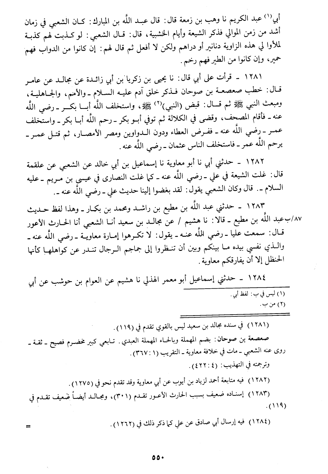 1281 - قَرَأْتُ عَلَى أَبِي قَالَ: نا يَحْيَى بْنُ زَكَرِيَّا بْنِ أَبِي زَائِدَةَ، عَنْ مُجَالِدٍ، عَنْ عَامِرٍ، قَالَ: خَطَبَ صَعْصَعَةُ بْنُ صُوحَانَ فَذَكَرَ خَلْقَ آدَمَ عَلَيْهِ السَّلَامُ وَالْأُمَمَ وَالْجَاهِلِيَّةَ وَمَبْعَثَ النَّبِيِّ صَلَّى اللهُ عَلَيْهِ وَسَلَّمَ ثُمَّ قَالَ: «قُبِضَ النَّبِيُّ صَلَّى اللهُ عَلَيْهِ وَسَلَّمَ §وَاسْتَخْلَفَ اللَّهُ أَبَا بَكْرٍ رَضِيَ اللَّهُ عَنْهُ فَأَقَامَ الْمُصْحَفَ وَقَضَى فِي الْكَلَالَةِ ثُمَّ تُوُفِّيَ أَبُو بَكْرٍ رَحِمَ اللَّهُ أَبَا بَكْرٍ وَاسْتُخْلِفَ عُمَرُ رَضِيَ اللَّهُ عَنْهُ فَفَرَضَ الْعَطَاءَ وَدَوَّنَ الدَّوَاوِينَ وَمَصَّرَ الْأَمْصَارَ ثُمَّ قُتِلَ عُمَرُ يَرْحَمُ اللَّهُ عُمَرَ فَاسْتَخْلَفَ النَّاسُ عُثْمَانَ رَضِيَ اللَّهُ عَنْهُ»