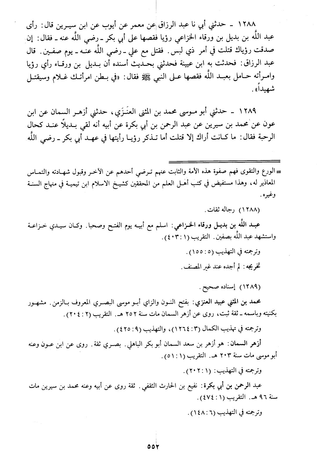 1289 - حَدَّثَنِي أَبُو مُوسَى مُحَمَّدُ بْنُ الْمُثَنَّى الْعَنَزِيُّ، حَدَّثَنِي أَزْهَرُ السَّمَّانُ، عَنِ ابْنِ عَوْنٍ، عَنْ مُحَمَّدِ بْنِ سِيرِينَ، عَنْ عَبْدِ الرَّحْمَنِ بْنِ أَبِي بَكْرَةَ، عَنْ أَبِيهِ، إِنَّهُ لَقِيَ بُدَيْلًا عِنْدَ كَحَالِ الرَّحَبَةِ فَقَالَ: مَا كُنْتُ أَرَاكَ إِلَّا قُتِلْتَ أَمَا تَذْكُرُ رُؤْيَا رَأَيْتَهَا فِي عَهْدِ أَبِي بَكْرٍ رَضِيَ اللَّهُ -[553]- عَنْهُ؟ فَقَالَ «§إِنْ صَدَقَتْ رُؤْيَاكَ قُتِلْتَ فِي أَمْرٍ مُلْتَبِسٍ؟» قَالَ مُحَمَّدٌ: «فَنُبِّئْتُ أَنَّهُ قًتِلَ يَوْمَ صِفِّينَ»