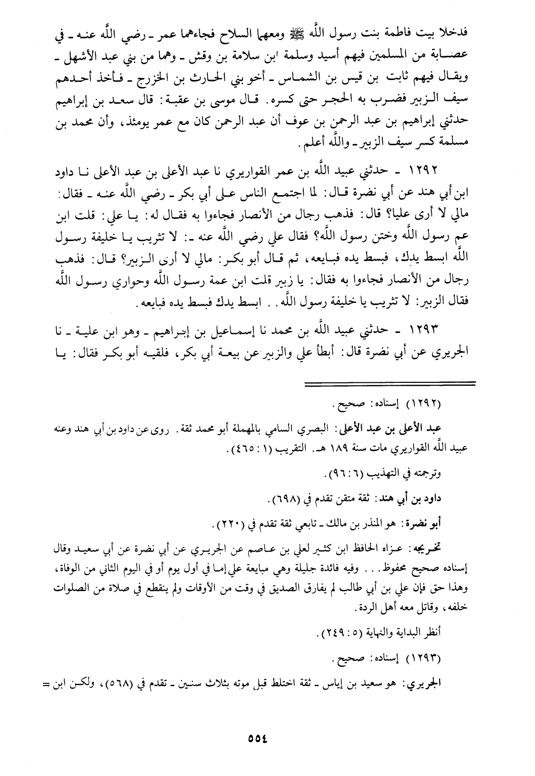 1293 - حَدَّثَنِي عُبَيْدُ اللَّهِ بْنُ مُحَمَّدٍ، نا إِسْمَاعِيلُ بْنُ إِبْرَاهِيمَ وَهُوَ ابْنُ عُلَيَّةَ نا الْجُرَيْرِيُّ، عَنْ أَبِي نَضْرَةَ، قَالَ: " أَبْطَأَ عَلِيٌّ وَالزُّبَيْرُ عَنْ بَيْعَةِ أَبِي بَكْرٍ، فَلَقِيَهُ أَبُو بَكْرٍ فَقَالَ: «§يَا -[555]- عَلِيُّ أَبْطَأْتَ عَنْ بَيْعَتِي وَأَنَا أَسْلَمْتُ، قَبْلَكَ» وَلَقِيَ الزُّبَيْرَ فَقَالَ: «يَا زُبَيْرُ أَبْطَأْتَ عَنْ بَيْعَتِي وَأَنَا أَسْلَمْتُ قَبْلَكَ»