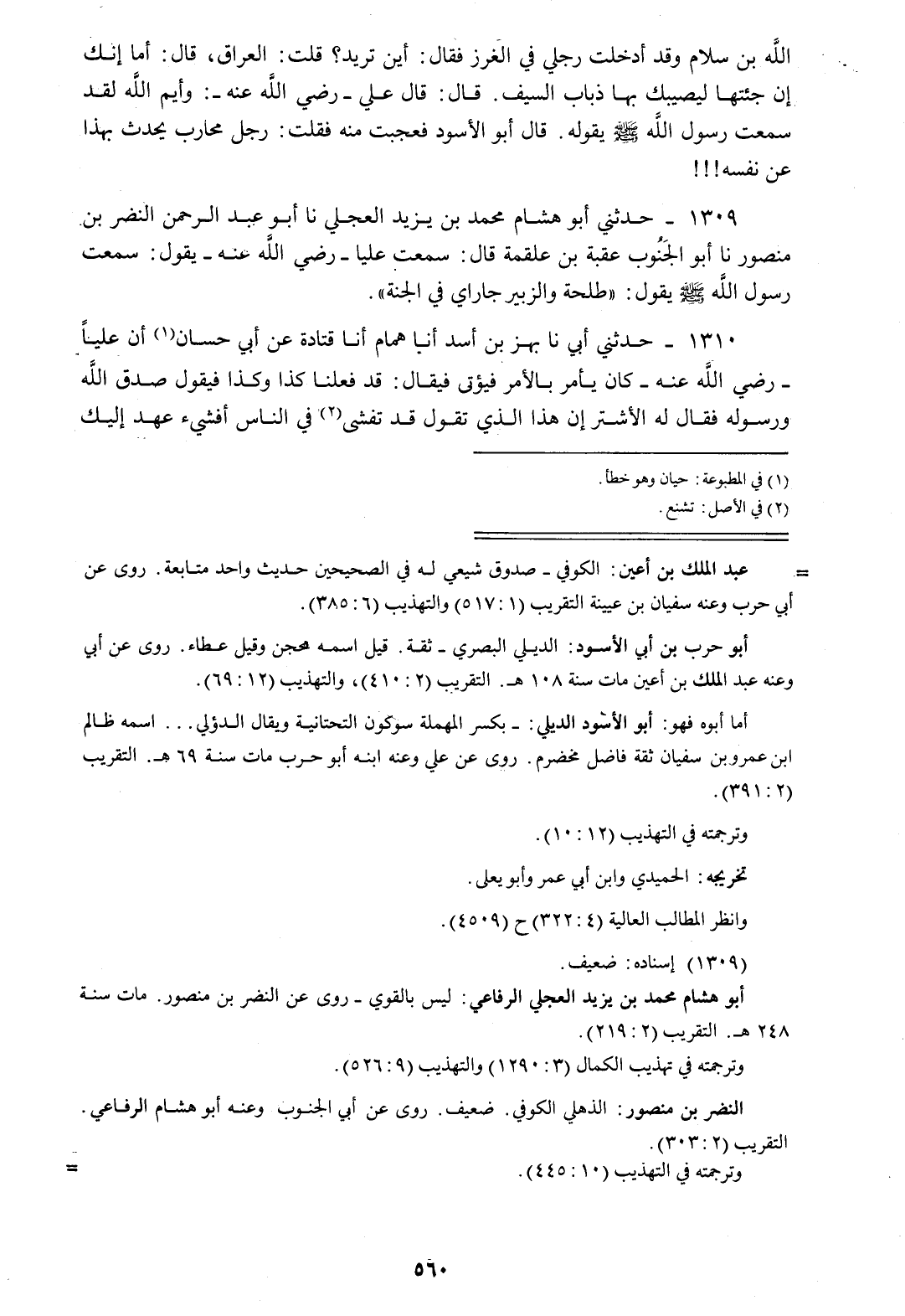 1309 - حَدَّثَنِي أَبُو هِشَامٍ مُحَمَّدُ بْنُ يَزِيدَ الْعِجْلِيُّ، نا أَبُو عَبْدِ الرَّحْمَنِ النَّضْرُ بْنُ مَنْصُورٍ، نا أَبُو الْجَنُوبِ عُقْبَةُ بْنُ عَلْقَمَةَ قَالَ: سَمِعْتُ عَلِيًّا رَضِيَ اللَّهُ عَنْهُ يَقُولُ: سَمِعْتُ رَسُولَ اللَّهِ صَلَّى اللهُ عَلَيْهِ وَسَلَّمَ يَقُولُ: «§طَلْحَةُ وَالزُّبَيْرُ جَارَايَ فِي الْجَنَّةِ»