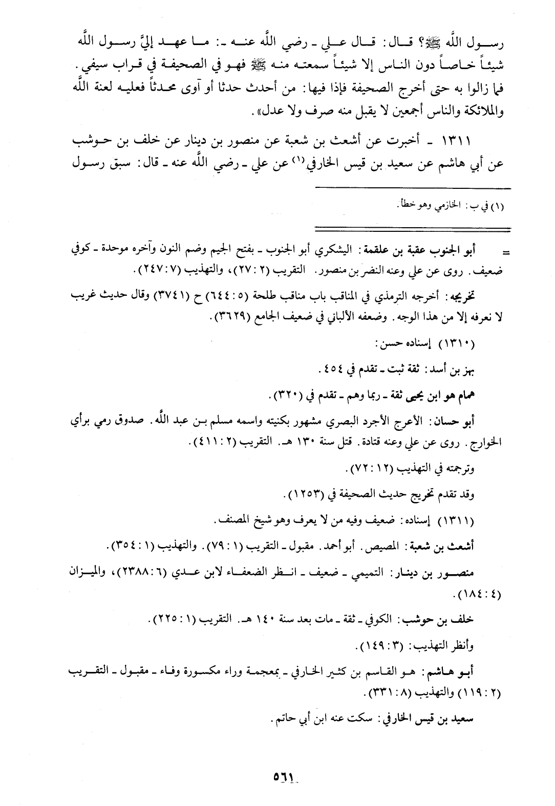 1311 - أُخْبِرْتُ عَنْ أَشْعَثَ بْنِ شُعْبَةَ، عَنْ مَنْصُورِ بْنِ دِينَارٍ، عَنْ خَلَفِ بْنِ حَوْشَبٍ، عَنْ أَبِي هَاشِمٍ، عَنْ قَيْسِ بْنِ سَعْدٍ الْخَارِفِيِّ، عَنْ عَلِيٍّ رَضِيَ اللَّهُ عَنْهُ قَالَ: «سَبَقَ رَسُولُ -[562]- اللَّهِ صَلَّى اللهُ عَلَيْهِ وَسَلَّمَ §وَصَلَّى أَبُو بَكْرٍ وَثَلَّثَ عُمَرُ رَضِيَ اللَّهُ عَنْهُمَا ثُمَّ كُنَّا قَوْمًا خَبَطَتْنَا فِتْنَةٌ مَا شَاءَ اللَّهُ»