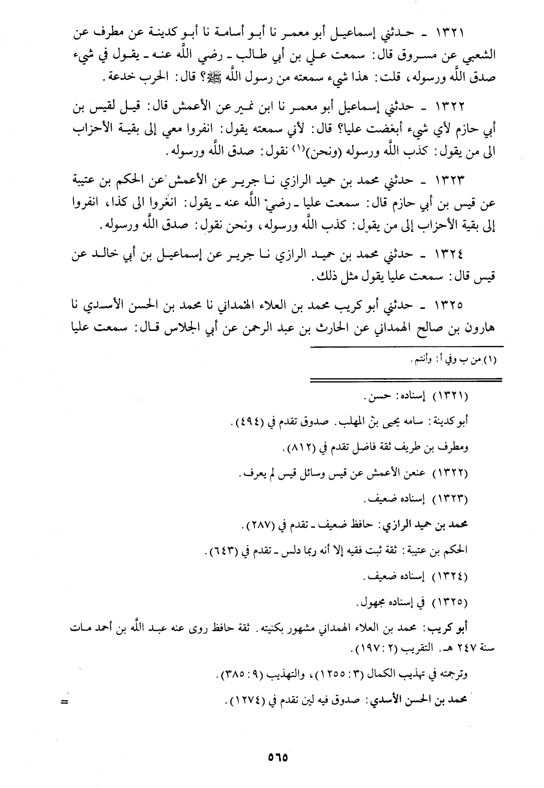 1322 - حَدَّثَنِي إِسْمَاعِيلُ أَبُو مَعْمَرٍ، نا ابْنُ نُمَيْرٍ، عَنِ الْأَعْمَشِ، قَالَ: قِيلَ لِقَيْسِ بْنِ أَبِي حَازِمٍ: لِأَيِّ شَيْءٍ أَبْغَضْتَ عَلِيًّا قَالَ: لِأَنِّي سَمِعْتُهُ يَقُولُ: «§انْفِرُوا مَعِي إِلَى بَقِيَّةِ الْأَحْزَابِ إِلَى مَنْ يَقُولُ كَذَبَ اللَّهُ وَرَسُولُهُ وَنَحْنُ نَقُولُ صَدَقَ اللَّهُ وَرَسُولُهُ»