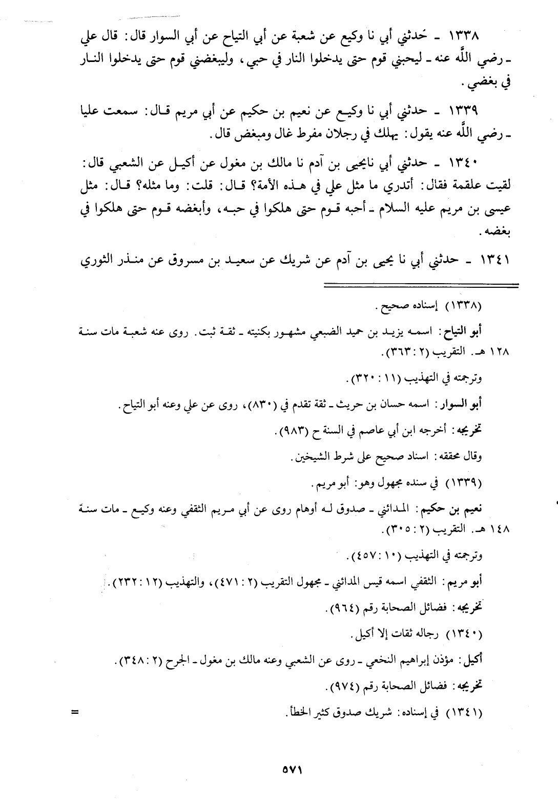 1338 - حَدَّثَنِي أَبِي، نا وَكِيعٌ، عَنْ شُعْبَةَ، عَنْ أَبِي التَّيَّاحِ، عَنْ أَبِي السَّوَّارِ، قَالَ: قَالَ عَلِيٌّ رَضِيَ اللَّهُ عَنْهُ: «§لَيُحِبُّنِي قَوْمٌ حَتَّى يَدْخُلُوا النَّارَ فِي حِبِّي وَلَيُبْغِضُنِي قَوْمٌ حَتَّى يَدْخُلُوا النَّارَ فِي بُغْضِي»