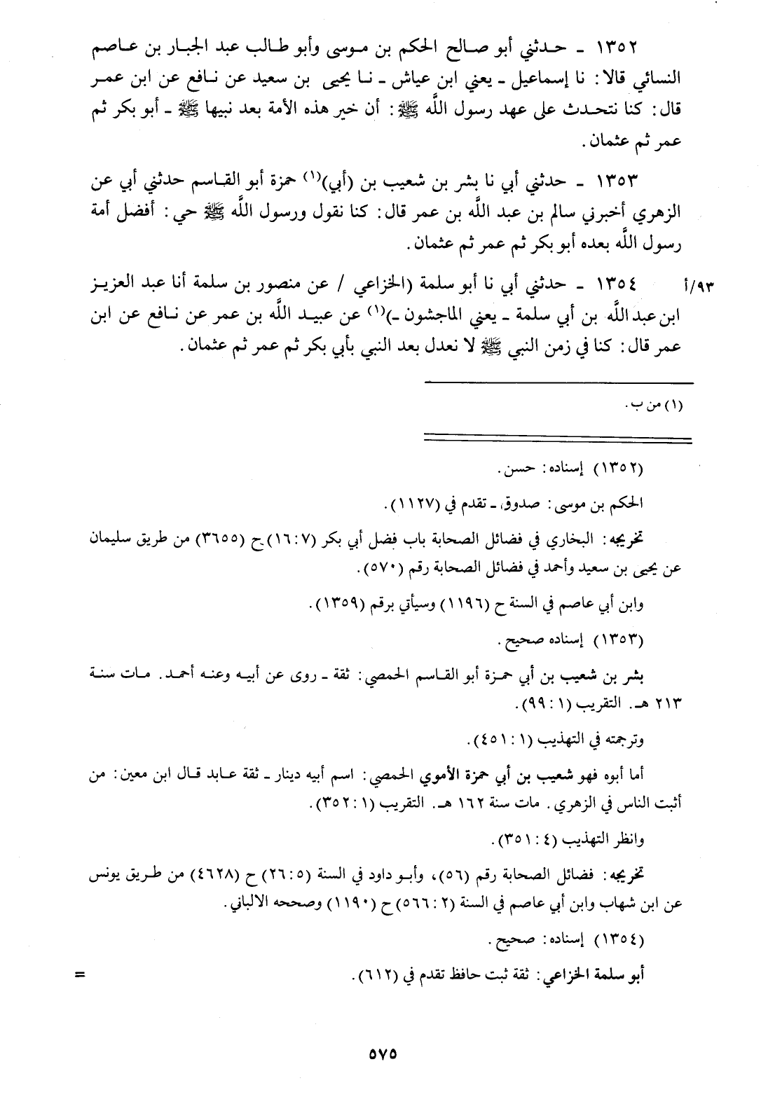 1353 - حَدَّثَنِي أَبِي، نا بِشْرُ بْنُ شُعَيْبِ بْنِ أَبِي حَمْزَةَ أَبُو الْقَاسِمِ، حَدَّثَنِي أَبِي، عَنِ الزُّهْرِيِّ، أَخْبَرَنِي سَالِمُ بْنُ عَبْدِ اللَّهِ بْنِ عُمَرَ، قَالَ: «كُنَّا نَقُولُ وَرَسُولُ اللَّهِ صَلَّى اللهُ عَلَيْهِ وَسَلَّمَ حَيٌّ §أَفْضَلُ أُمَّةِ رَسُولِ اللَّهِ بَعْدَهُ أَبُو بَكْرٍ ثُمَّ عُمَرُ ثُمَّ عُثْمَانُ»