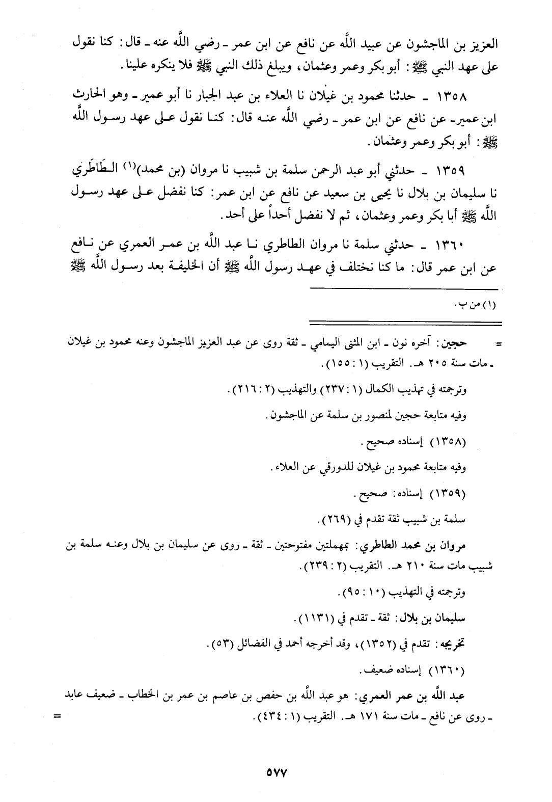 1359 - حَدَّثَنِي أَبُو عَبْدِ الرَّحْمَنِ سَلَمَةُ بْنُ شَبِيبٍ، نا مَرْوَانُ بْنُ مُحَمَّدٍ الطَّاطَرِيُّ، نا سُلَيْمَانُ بْنُ بِلَالٍ، نا يَحْيَى بْنُ سَعِيدٍ، عَنْ نَافِعٍ، عَنِ ابْنِ عُمَرَ «كُنَّا §نُفَضِّلُ عَلَى عَهْدِ رَسُولِ اللَّهِ صَلَّى اللهُ عَلَيْهِ وَسَلَّمَ أَبَا بَكْرٍ وَعُمَرَ وَعُثْمَانَ ثُمَّ لَا نُفَضِّلُ أَحَدًا عَلَى أَحَدٍ»