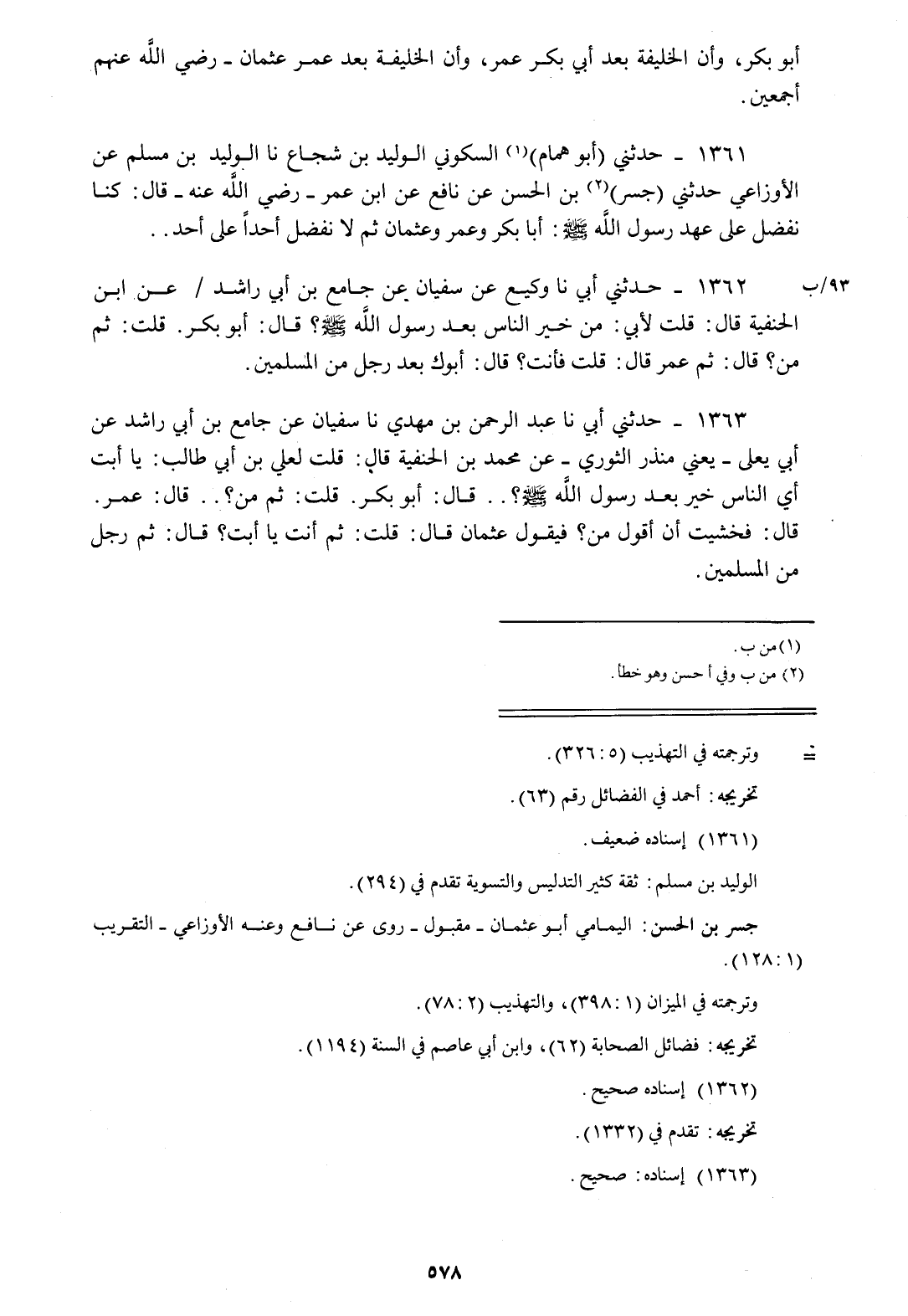 1361 - حَدَّثَنِي أَبُو هَمَّامٍ السَّكُونِيُّ الْوَلِيدُ بْنُ شُجَاعٍ، نا الْوَلِيدُ بْنُ مُسْلِمٍ، عَنِ الْأَوْزَاعِيِّ، حَدَّثَنِي جَسْرُ بْنُ الْحَسَنِ، عَنْ نَافِعٍ، عَنِ ابْنِ عُمَرَ رَضِيَ اللَّهُ عَنْهُ قَالَ: «§كُنَّا نُفَضِّلُ عَلَى عَهْدِ رَسُولِ اللَّهِ صَلَّى اللهُ عَلَيْهِ وَسَلَّمَ أَبَا بَكْرٍ وَعُمَرَ وَعُثْمَانَ ثُمَّ لَا نُفَضِّلُ أَحَدًا عَلَى أَحَدٍ»