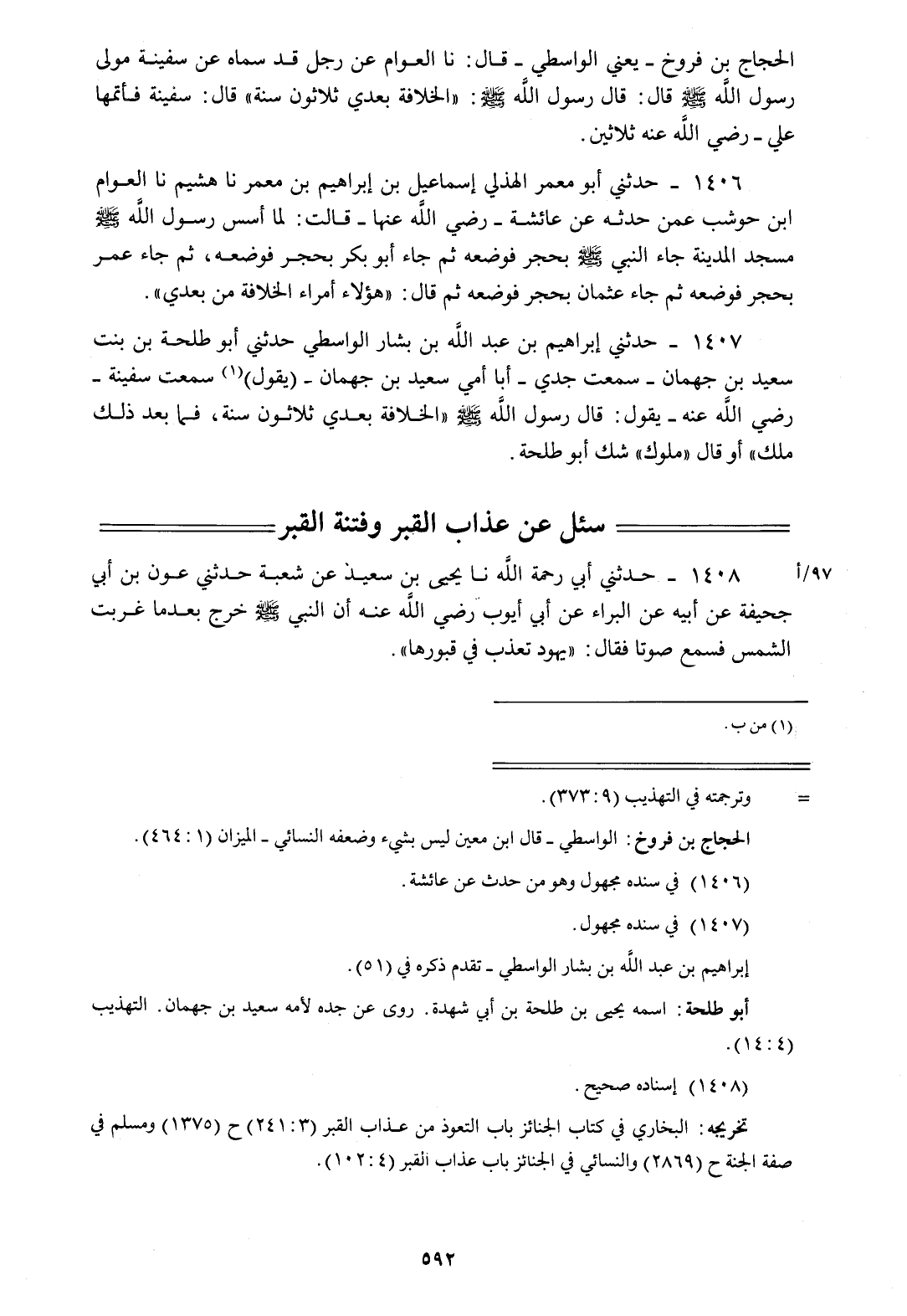 1407 - حَدَّثَنِي إِبْرَاهِيمُ بْنُ عَبْدِ اللَّهِ بْنِ بَشَّارٍ الْوَاسِطِيُّ، حَدَّثَنِي أَبُو طَلْحَةَ ابْنُ بِنْتِ سَعِيدِ بْنِ جَمْهَانَ، سَمِعْتُ جَدِّيَ أَبَا أُمِّي سَعِيدَ بْنَ جَمْهَانَ يَقُولُ: سَمِعْتُ سَفِينَةَ رَضِيَ اللَّهُ عَنْهُ يَقُولُ: قَالَ رَسُولُ اللَّهِ صَلَّى اللهُ عَلَيْهِ وَسَلَّمَ: " §الْخِلَافَةُ بَعْدِي ثَلَاثُونَ سَنَةً فَمَا بَعْدَ ذَلِكَ مُلْكٌ، أَوْ قَالَ: مُلُوكٌ " شَكَّ أَبُو طَلْحَةَ