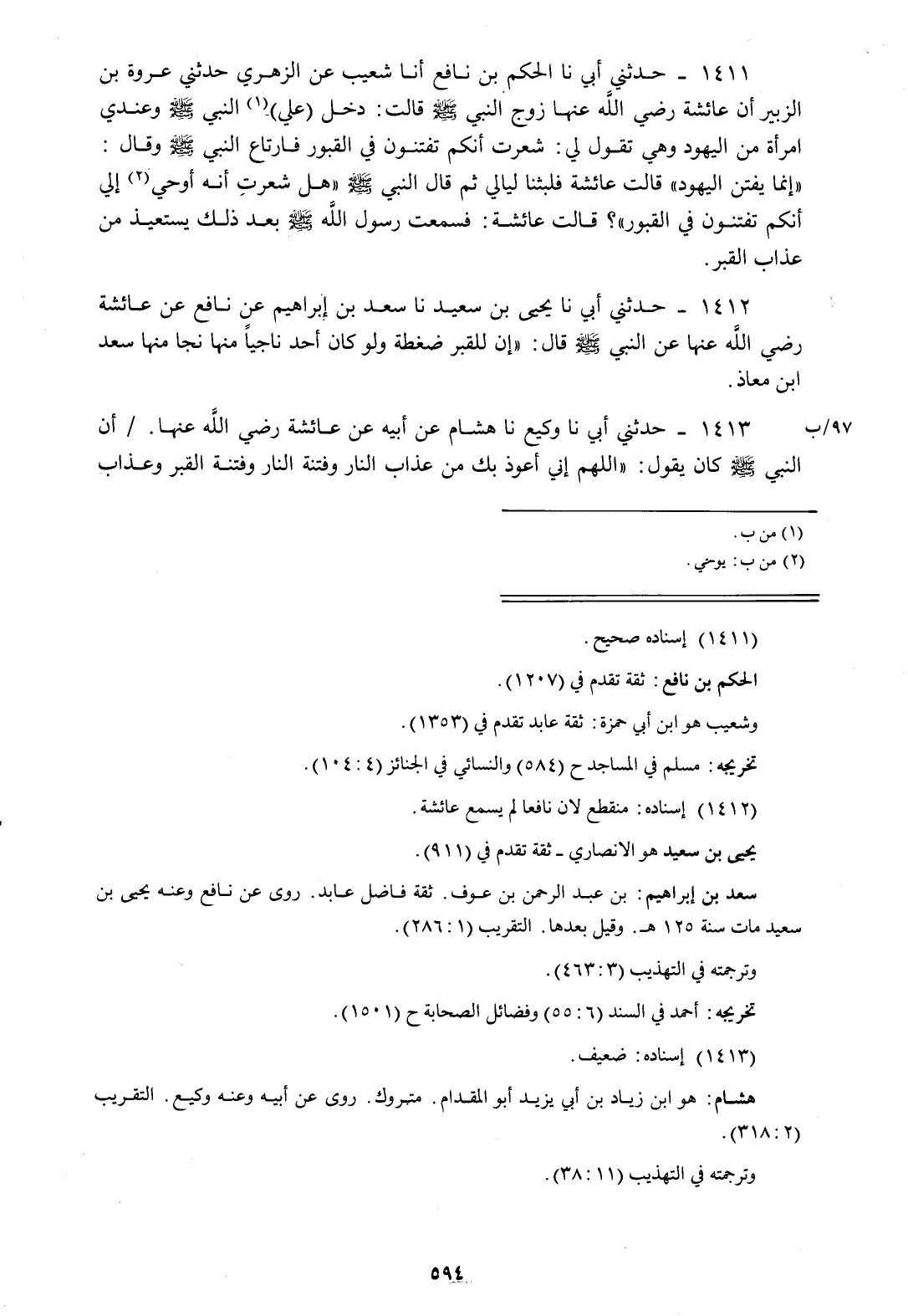 1411 - حَدَّثَنِي أَبِي، نا الْحَكَمُ بْنُ نَافِعٍ، أَنَا شُعَيْبٌ، عَنِ الزُّهْرِيِّ، حَدَّثَنِي عُرْوَةُ بْنُ الزُّبَيْرِ، أَنَّ عَائِشَةَ رَضِيَ اللَّهُ عَنْهَا زَوْجَ النَّبِيِّ صَلَّى اللهُ عَلَيْهِ وَسَلَّمَ قَالَتْ: دَخَلَ عَلَيَّ النَّبِيُّ صَلَّى اللهُ عَلَيْهِ وَسَلَّمَ وَعِنْدِي امْرَأَةٌ مِنَ الْيَهُودِ وَهِيَ تَقُولُ لِي: شَعَرْتُ أَنَّكُمْ تُفْتَنُونَ فِي الْقُبُورِ فَارْتَاعَ النَّبِيُّ صَلَّى اللهُ عَلَيْهِ وَسَلَّمَ وَقَالَ: «إِنَّمَا يُفْتَنُ الْيَهُودُ» قَالَتْ عَائِشَةُ: فَلَبِثْنَا لَيَالِي ثُمَّ قَالَ النَّبِيُّ صَلَّى اللهُ عَلَيْهِ وَسَلَّمَ: «هَلْ شَعَرْتِ أَنَّهُ أُوحِيَ إِلَيَّ أَنَّكُمْ تُفْتَنُونَ فِي الْقُبُورِ» قَالَتْ عَائِشَةُ: فَسَمِعْتُ رَسُولَ اللَّهِ صَلَّى اللهُ عَلَيْهِ وَسَلَّمَ بَعْدَ ذَلِكَ §يَسْتَعِيذُ مِنْ عَذَابِ الْقَبْرِ "