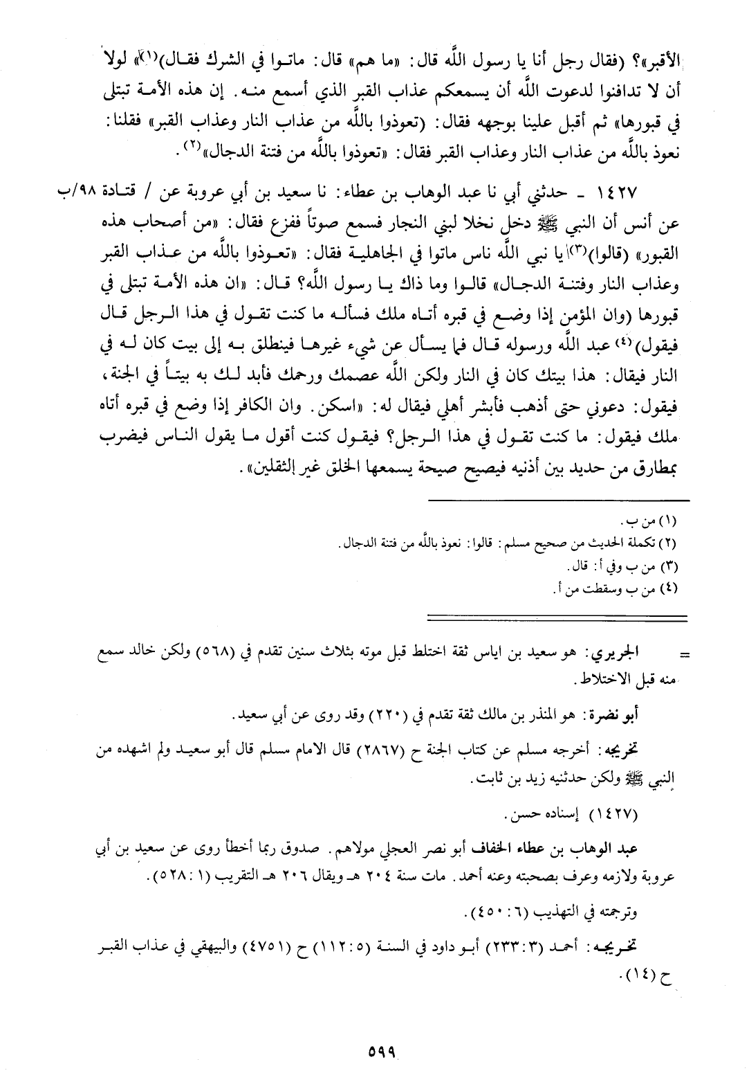 1427 - حَدَّثَنِي أَبِي، نا عَبْدُ الْوَهَّابِ بْنُ عَطَاءٍ، نا سَعِيدُ بْنُ أَبِي عَرُوبَةَ، عَنْ قَتَادَةَ، عَنْ أَنَسٍ أَنَّ النَّبِيَّ صَلَّى اللهُ عَلَيْهِ وَسَلَّمَ دَخَلَ نَخْلًا لِبَنِي النَّجَّارِ فَسَمِعَ صَوْتًا فَفَزِعَ فَقَالَ: " مَنْ أَصْحَابُ هَذِهِ الْقُبُورِ؟ قَالُوا: يَا نَبِيَّ اللَّهِ نَاسٌ مَاتُوا فِي الْجَاهِلِيَّةِ. فَقَالَ: «§تَعَوَّذُوا بِاللَّهِ مِنْ عَذَابِ الْقَبْرِ وَعَذَابِ النَّارِ وَفِتْنَةِ الدَّجَّالِ» قَالُوا: وَمَا ذَاكَ يَا رَسُولَ اللَّهِ؟ قَالَ: " إِنَّ هَذِهِ الْأُمَّةَ تُبْتَلَى فِي قُبُورِهَا وَإِنَّ الْمُؤْمِنَ إِذَا وُضِعَ فِي قَبْرِهِ أَتَاهُ مَلَكٌ فَسَأَلَهُ مَا كُنْتَ تَقُولُ فِي هَذَا الرَّجُلِ قَالَ: فَيَقُولُ عَبْدُ اللَّهِ وَرَسُولُهُ قَالَ: فَمَا يُسْأَلُ عَنْ شَيْءٍ غَيْرِهَا فَيُنْطَلَقُ بِهِ إِلَى بَيْتٍ كَانَ لَهُ فِي النَّارِ فَيُقَالُ هَذَا بَيْتُكَ كَانَ فِي النَّارِ وَلَكِنَّ اللَّهَ عَصَمَكَ وَرَحِمَكَ فَأَبْدَلَكَ بِهِ بَيْتًا فِي الْجَنَّةِ فَيَقُولُ دَعُونِي حَتَّى أَذْهَبَ فَأُبَشِّرَ أَهْلِي. فَيُقَالُ لَهُ: اسْكُنْ. وَأَنَّ الْكَافِرَ إِذَا وُضِعَ فِي قَبْرِهِ أَتَاهُ مَلَكٌ فَيَقُولُ: مَا كُنْتَ تَقُولُ فِي هَذَا الرَّجُلِ؟ فَيَقُولُ: كُنْتُ أَقُولُ مَا يَقُولُ النَّاسُ فَيُضْرَبُ بِمَطَارِقَ مِنْ حَدِيدٍ بَيْنَ أُذُنَيْهِ فَيَصِيحُ صَيْحَةً يَسْمَعُهَا الْخَلْقُ غَيْرَ الثَّقَلَيْنِ "