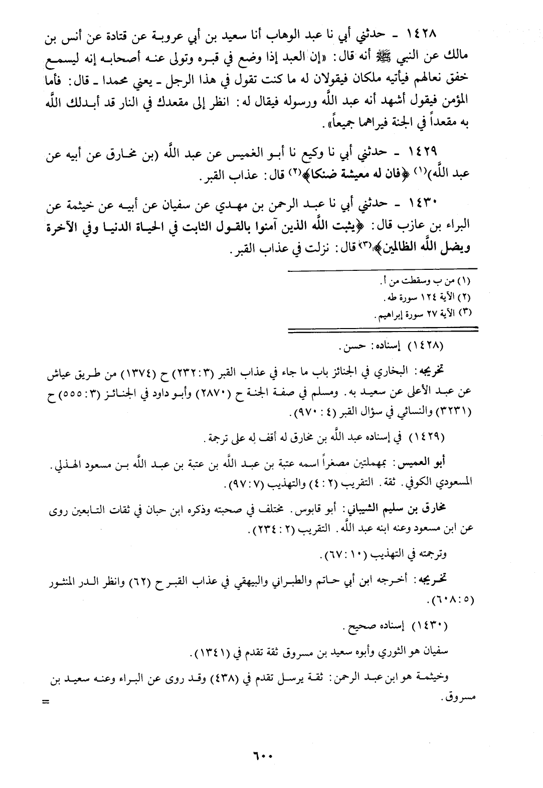 1430 - حَدَّثَنِي أَبِي، نا عَبْدُ الرَّحْمَنِ بْنُ مَهْدِيٍّ، عَنْ سُفْيَانَ، عَنْ أَبِيهِ، عَنْ خَيْثَمَةَ، عَنِ الْبَرَاءِ بْنِ عَازِبٍ قَالَ: {يُثَبِّتُ اللَّهُ الَّذِينَ آمَنُوا بِالْقَوْلِ الثَّابِتِ فِي الْحَيَاةِ الدُّنْيَا وَفِي الْآخِرَةِ وَيُضِلُّ اللَّهُ الظَّالِمِينَ} [إبراهيم: 27] قَالَ: «§نَزَلَتْ فِي عَذَابِ الْقَبْرِ»