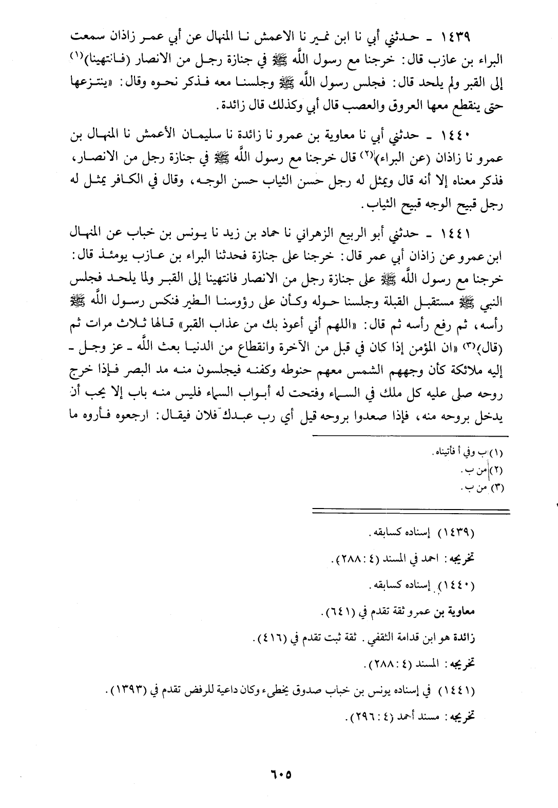 1441 - حَدَّثَنِي أَبُو الرَّبِيعِ الزَّهْرَانِيِّ، نا حَمَّادُ بْنُ زَيْدٍ، نا يُونُسُ بْنُ خَبَّابٍ، عَنِ الْمِنْهَالِ بْنِ عَمْرٍو، عَنْ زَاذَانَ أَبِي عُمَرَ، قَالَ: خَرَجْنَا عَلَى جَنَازَةٍ فَحَدَّثَنَا الْبَرَاءُ بْنُ عَازِبٍ، يَوْمَئِذٍ قَالَ: خَرَجْنَا مَعَ رَسُولِ اللَّهِ صَلَّى اللهُ عَلَيْهِ وَسَلَّمَ عَلَى جَنَازَةِ رَجُلٍ مِنَ الْأَنْصَارِ فَانْتَهَيْنَا إِلَى الْقَبْرِ وَلَمَّا يُلَحَّدُ فَجَلَسَ النَّبِيُّ صَلَّى اللهُ عَلَيْهِ وَسَلَّمَ مُسْتَقْبِلَ الْقِبْلَةَ وَجَلَسْنَا حَوْلَهُ وَكَأَنَّ عَلَى رُءُوسِنَا الطَّيْرُ فَنَكَّسَ رَسُولَ اللَّهِ صَلَّى اللهُ عَلَيْهِ وَسَلَّمَ رَأْسَهُ ثُمَّ رَفَعَ رَأْسَهُ ثُمَّ قَالَ: " اللَّهُمَّ إِنِّي أَعُوذُ بِكَ مِنْ عَذَابِ الْقَبْرِ قَالَهَا ثَلَاثَ مَرَّاتٍ ثُمَّ قَالَ: " إِنَّ §الْمُؤْمِنَ إِذَا كَانَ فِي قُبُلٍ مِنَ الْآخِرَةِ وَانْقِطَاعٍ مِنَ الدُّنْيَا بَعَثَ اللَّهُ عَزَّ وَجَلَّ إِلَيْهِ مَلَائِكَةً كَأَنَّ وُجُوهَهُمُ الشَّمْسُ مَعَهُمْ حَنُوطُهُ وَكَفَنُهُ فَيَجْلِسُونَ مِنْهُ مَدَّ الْبَصَرِ فَإِذَا خَرَجَ رُوحُهُ صَلَّى عَلَيْهِ كُلُّ مَلَكٍ فِي السَّمَاءِ وَفُتِحَتْ لَهُ أَبْوَابُ السَّمَاءِ فَلَيْسَ مِنْهُ بَابٌ إِلَّا يُحِبُّ أَنْ يَدْخُلَ بِرُوحِهِ مِنْهُ فَإِذَا صَعِدُوا بِرُوحِهِ قِيلَ أَيْ رَبِّ عَبْدُكَ فُلَانٌ فَيُقَالُ أَرْجِعُوهُ فَأَرَوْهُ مَا -[606]- أَعْدَدْتُ لَهُ مِنَ الْكَرَامَةِ فَإِنِّي وَعَدْتَهُ {مِنْهَا خَلَقْنَاكُمْ وَفِيهَا نُعِيدُكُمْ وَمِنْهَا نُخْرِجُكُمْ تَارَةً أُخْرَى} [طه: 55] وَإِنَّهُ لَيَسْمَعُ خَفْقَ نِعَالِهِمْ إِذَا وَلَّوْا مُدْبِرِينَ حِينَ يُقَالُ أَجِبْنَا يَا هَذَا مَنْ رَبُّكَ وَمَا دِينُكَ وَمَنْ نَبِيُّكَ؟ فَيَقُولُ رَبِّيَ اللَّهُ وَدِينِيَ الْإِسْلَامُ وَنَبِيِّي مُحَمَّدٌ صَلَّى اللهُ عَلَيْهِ وَسَلَّمَ فَنَادَاهُ مُنَادٍ صَدَقْتَ وَذَلِكَ قَوْلُهُ عَزَّ وَجَلَّ {يُثَبِّتُ اللَّهُ الَّذِينَ آمَنُوا بِالْقَوْلِ الثَّابِتِ فِي الْحَيَاةِ الدُّنْيَا وَفِي الْآخِرَةِ وَيُضِلُّ اللَّهُ الظَّالِمِينَ وَيَفْعَلُ اللَّهُ مَا يَشَاءُ} [إبراهيم: 27] ثُمَّ يَأْتِي آتٍ حَسَنُ الْوَجْهِ طَيِّبُ الرِّيحِ حَسَنُ الثِّيَابِ فَيَقُولُ أَبْشِرْ بِرَحْمَةٍ مِنَ اللَّهِ وَجَنَّاتٍ فِيهَا نَعِيمٌ مُقِيمٌ فَيَقُولُ وَأَنْتَ فَبَشَّرَكَ اللَّهُ بِخَيْرٍ وَمَنْ أَنْتَ فَوَجْهُكَ الْوَجْهُ يُبَشِّرُ بِالْخَيْرِ فَيَقُولُ أَنَا عَمَلُكَ الصَّالِحُ وَاللَّهِ مَا عَلِمْتُكَ إِنْ كُنْتَ لَسَرِيعًا فِي طَاعَةِ اللَّهِ بَطِيئًا عَنْ مَعْصِيَةِ اللَّهِ فَجَزَاكَ اللَّهُ خَيْرًا ثُمَّ يُنَادِي مُنَادٍ أَفْرِشُوهُ مِنْ فُرُشِ الْجَنَّةِ وَافْتَحُوا لَهُ بَابًا إِلَى الْجَنَّةِ فَيُفْرَشُ لَهُ مِنْ فُرُشِ الْجَنَّةِ وَيُفْتَحُ لَهُ بَابٌ إِلَى الْجَنَّةِ فَيَقُولُ: يَا رَبِّ أَقِمِ السَّاعَةَ حَتَّى أَرْجِعَ إِلَى أَهْلِي وَمَالِي وَإِنَّ الْكَافِرَ إِذَا كَانَ فِي قُبُلٍ مِنَ الْآخِرَةِ وَانْقِطَاعٍ مِنَ الدُّنْيَا أَنْزَلَ اللَّهُ مَلَائِكَةً غِلَاظًا شِدَادًا مَعَهُمْ ثِيَابٌ مِنْ نَارٍ وَسَرَابِيلُ مِنْ قَطِرَانٍ فَيَحْتَوِشُونَهُ فَيُنْتَزَعُ نَفْسُهُ مِنَ الْعَصَبِ وَالْعُرُوقِ فَإِذَا أُخْرِجَتْ نَفْسُهُ لَعَنَهُ كُلُّ مَلَكٌ بَيْنَ السَّمَاءِ وَالْأَرْضِ وَكُلُّ مَلَكٍ فِي السَّمَاءِ وَغُلِّقَتْ أَبْوَابُ السَّمَاءِ لَيْسَ مِنْهَا بَابٌ أَلَا يَكْرَهُ أَنْ يَدْخُلَ بِرُوحِهِ مِنْهُ ثُمَّ يُقَالُ أَيْ رَبِّ عَبْدُكَ فُلَانٌ لَمْ تَقْبَلْهُ أَرْضٌ وَلَا سَمَاءٌ فَيُقَالُ أَرْجِعُوهُ فَأَرُوهُ مَا أَعْدَدْتُ لَهُ مِنَ الشَّرِّ إِنِّي وَعَدْتُهُ {مِنْهَا خَلَقْنَاك