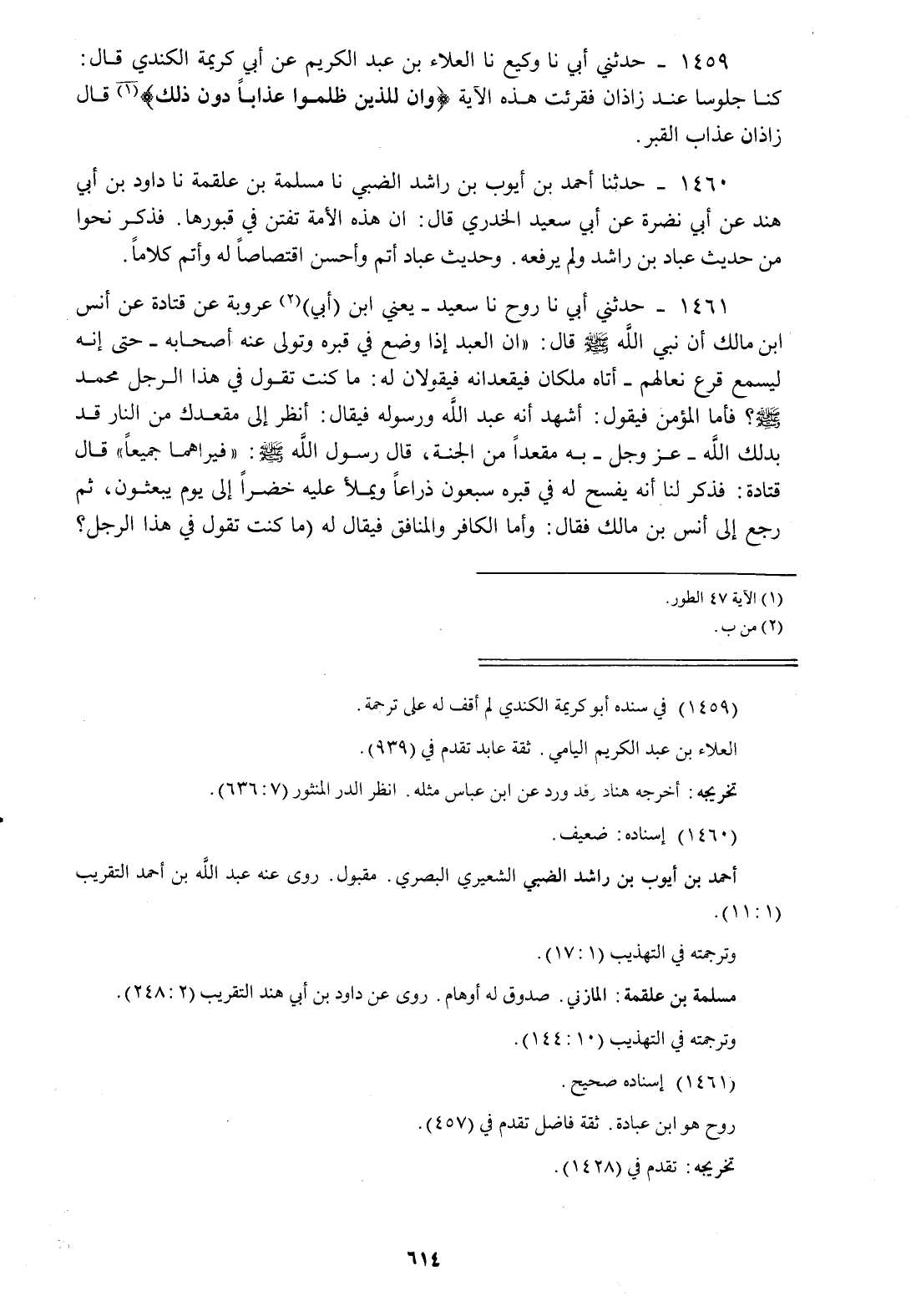 1460 - حَدَّثَنَا أَحْمَدُ بْنُ أَيُّوبَ بْنِ رَاشِدٍ الضَّبِّيُّ، نا مَسْلَمَةُ بْنُ عَلْقَمَةَ، نا دَاوُدُ بْنُ أَبِي هِنْدَ، عَنْ أَبِي نَضْرَةَ، عَنْ أَبِي سَعِيدٍ الْخُدْرِيِّ قَالَ: «إِنَّ §هَذِهِ الْأُمَّةَ تُفْتَنُ فِي قُبُورِهَا» فَذَكَرَ نَحْوًا مِنْ حَدِيثِ عَبَّادِ بْنِ رَاشِدٍ وَلَمْ يَرْفَعْهُ، وَحَدِيثُ عَبَّادٍ أَتَمُّ وَأَحْسَنُ اقْتِصَاصًا لَهُ وَأَتَمُّ كَلَامًا