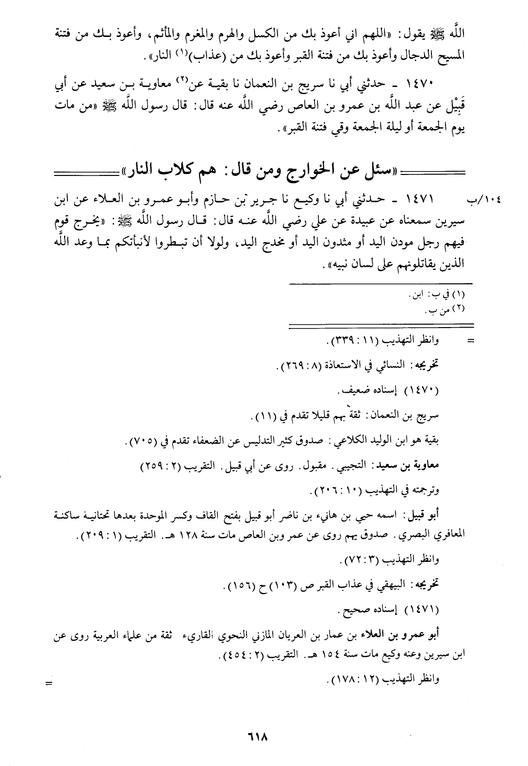 1470 - حَدَّثَنِي أَبِي، نا سُرَيْجُ بْنُ النُّعْمَانِ، نا بَقِيَّةُ، عَنْ مُعَاوِيَةَ بْنِ سَعِيدٍ، عَنْ أَبِي قَبِيلٍ، عَنْ عَبْدِ اللَّهِ بْنِ عَمْرِو بْنِ الْعَاصِ رَضِيَ اللَّهُ عَنْهُ قَالَ: قَالَ رَسُولُ اللَّهِ صَلَّى اللهُ عَلَيْهِ وَسَلَّمَ: «§مَنْ مَاتَ يَوْمَ الْجُمُعَةِ أَوْ لَيْلَةَ الْجُمُعَةِ وُقِيَ فِتْنَةَ الْقَبْرِ»