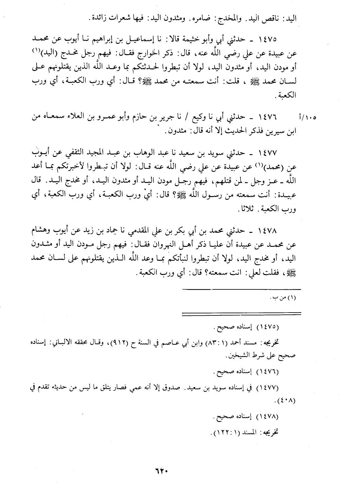 1475 - حَدَّثَنِي أَبِي وَأَبُو خَيْثَمَةَ، قَالَا: نا إِسْمَاعِيلُ بْنُ إِبْرَاهِيمَ، نا أَيُّوبُ، عَنْ مُحَمَّدٍ، عَنْ عَبِيدَةَ، عَنْ عَلِيٍّ رَضِيَ اللَّهُ عَنْهُ قَالَ: ذَكَرَ §الْخَوَارِجَ فَقَالَ: " فِيهِمْ رَجُلٌ مُخْدَجُ الْيَدِ أَوْ مُودَنُ الْيَدِ أَوْ مَثْدُونُ الْيَدِ لَوْلَا أَنْ تَبْطَرُوا لَحَدَّثْتُكُمْ بِمَا وَعَدَ اللَّهُ الَّذِينَ يَقْتُلُونَهُمْ عَلَى لِسَانِ مُحَمَّدٍ صَلَّى اللهُ عَلَيْهِ وَسَلَّمَ قُلْتُ: أَنْتَ سَمِعْتَهُ مِنْ مُحَمَّدٍ صَلَّى اللهُ عَلَيْهِ وَسَلَّمَ؟ قَالَ: «إِي وَرَبِّ الْكَعْبَةِ إِي وَرَبِّ الْكَعْبَةِ»