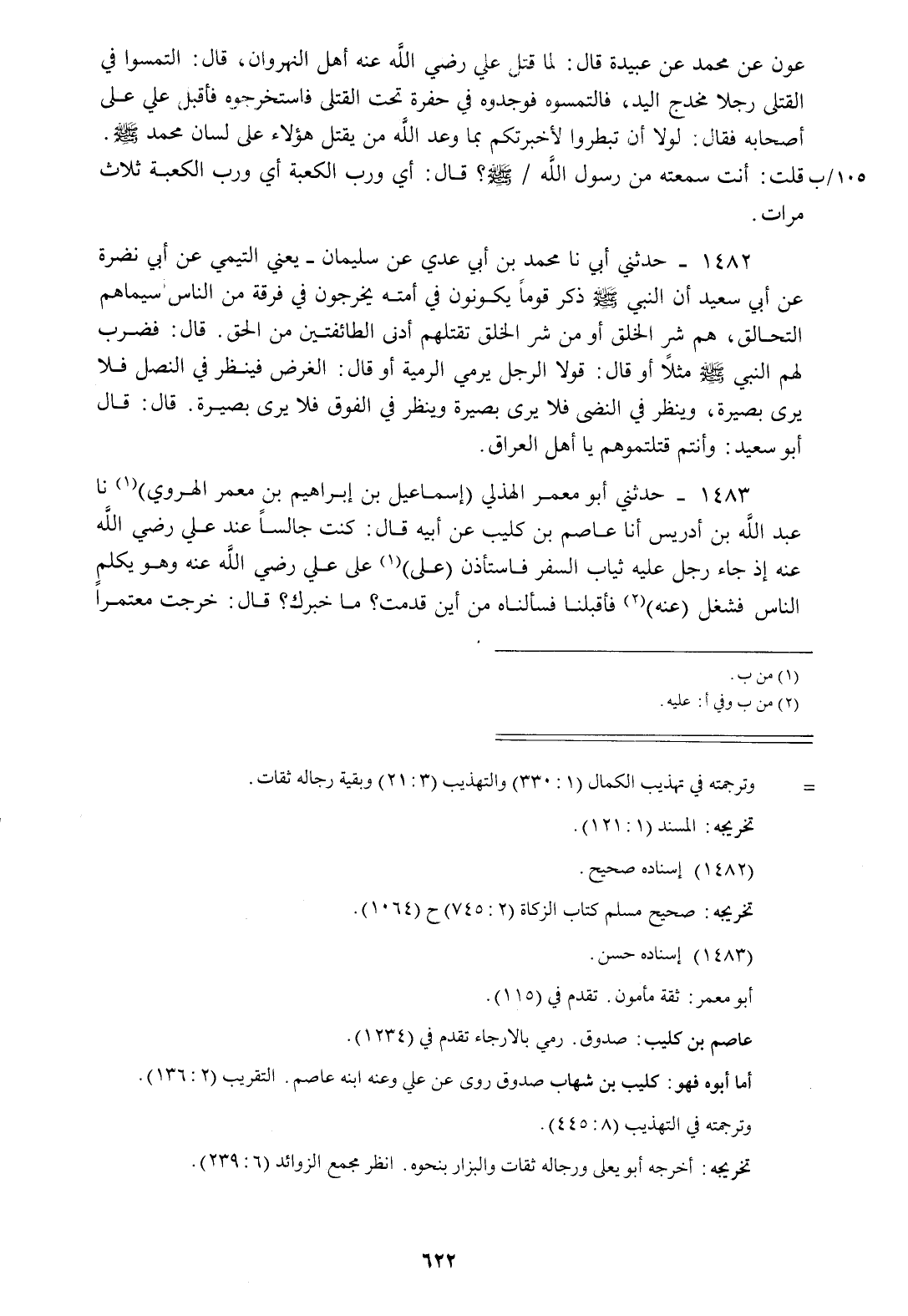 1482 - حَدَّثَنِي أَبِي، نا مُحَمَّدُ بْنُ أَبِي عَدِيٍّ، عَنْ سُلَيْمَانَ يَعْنِي التَّيْمِيَّ، عَنْ أَبِي نَضْرَةَ، عَنْ أَبِي سَعِيدٍ، أَنَّ النَّبِيَّ صَلَّى اللهُ عَلَيْهِ وَسَلَّمَ ذَكَرَ «قَوْمًا يَكُونُونَ فِي أُمَّتِهِ يَخْرُجُونَ فِي §فِرْقَةٍ مِنَ النَّاسِ سِيمَاهُمُ التَّحَالُقُ هُمْ شَرُّ الْخَلْقِ أَوْ مِنْ شَرِّ الْخَلْقِ تَقْتُلُهُمْ أَدْنَى الطَّائِفَتَيْنِ مِنَ الْحَقِّ» قَالَ: فَضَرَبَ لَهُمُ النَّبِيُّ صَلَّى اللهُ عَلَيْهِ وَسَلَّمَ مَثَلًا أَوْ قَالَ: قَوْلًا الرَّجُلُ يَرْمِي الرَّمِيَّةَ أَوْ قَالَ: الْغَرَضَ فَيَنْظُرُ فِي النَّصْلِ فَلَا يَرَى بَصِيرَةً وَيَنْظُرُ فِي النَّضِيِّ فَلَا يَرَى بَصِيرَةً وَيَنْظُرُ فِي الْفُوقِ فَلَا يَرَى بَصِيرَةً قَالَ: قَالَ أَبُو سَعِيدٍ: وَأَنْتُمْ قَتَلْتُمُوهُمْ يَا أَهْلَ الْعِرَاقِ "