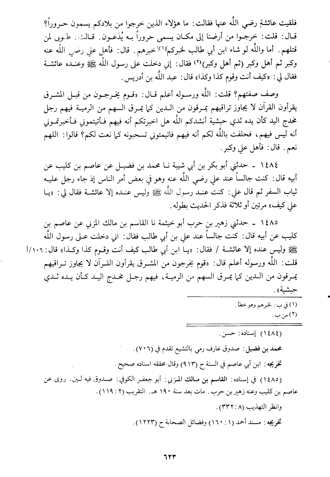1485 - حَدَّثَنِي زُهَيْرُ بْنُ حَرْبٍ أَبُو خَيْثَمَةَ، نا الْقَاسِمُ بْنُ مَالِكٍ الْمُزَنِيُّ، عَنْ عَاصِمِ بْنِ كُلَيْبٍ، عَنْ أَبِيهِ، قَالَ: كُنْتُ جَالِسًا عِنْدَ عَلِيِّ بْنِ أَبِي طَالِبٍ فَقَالَ: إِنِّي دَخَلْتُ عَلَى رَسُولِ اللَّهِ صَلَّى اللهُ عَلَيْهِ وَسَلَّمَ وَلَيْسَ عِنْدَهُ إِلَّا عَائِشَةُ فَقَالَ: «يَا ابْنَ أَبِي طَالِبٍ كَيْفَ أَنْتَ وَقَوْمٌ كَذَا وَكَذَا» قَالَ: قُلْتُ: اللَّهُ وَرَسُولُهُ أَعْلَمُ. قَالَ: «§قَوْمٌ يَخْرُجُونَ مِنَ الْمَشْرِقِ يَقْرَءُونَ الْقُرْآنَ لَا يُجَاوِزُ تَرَاقِيَهُمْ يَمْرُقُونَ مِنَ الدِّينِ كَمَا يَمْرُقُ السَّهْمُ مِنَ الرَّمِيَّةِ فِيهِمْ رَجُلٌ مُخْدَجُ الْيَدِ كَأَنَّ يَدَهُ ثَدْيُ حَبَشِيَّةٍ»