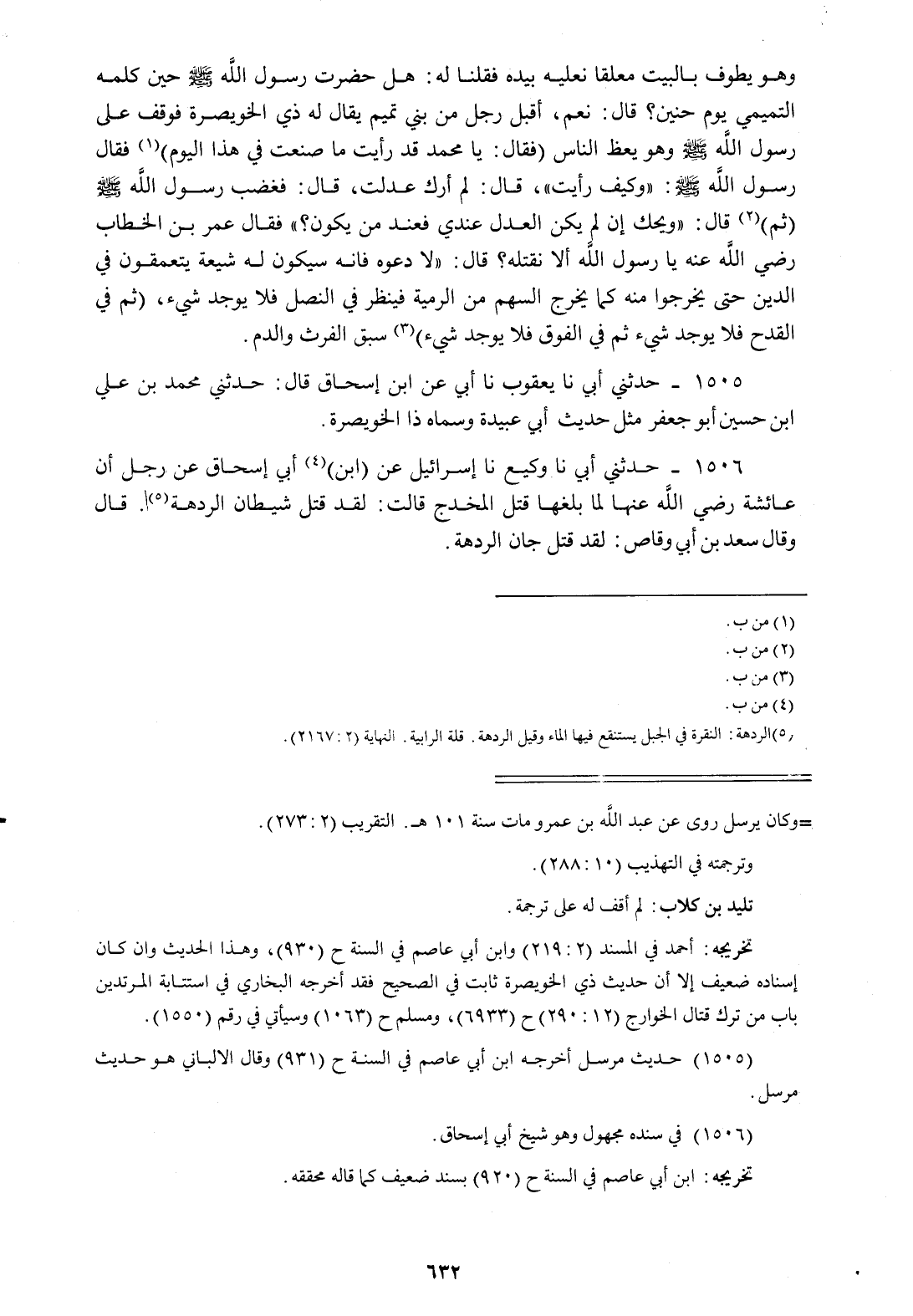 1506 - حَدَّثَنِي أَبِي، نا وَكِيعٌ، نا إِسْرَائِيلُ، عَنِ ابْنِ أَبِي إِسْحَاقَ، عَنْ رَجُلٍ، أَنَّ عَائِشَةَ رَضِيَ اللَّهُ عَنْهَا لَمَّا بَلَغَهَا قَتْلُ الْمُخْدَجِ قَالَتْ: «لَقَدْ §قُتِلَ شَيْطَانُ الرَّدْهَةِ» قَالَ: وَقَالَ سَعْدُ بْنُ أَبِي وَقَّاصٍ: «لَقَدْ قُتِلَ جَانُّ الرَّدْهَةِ»