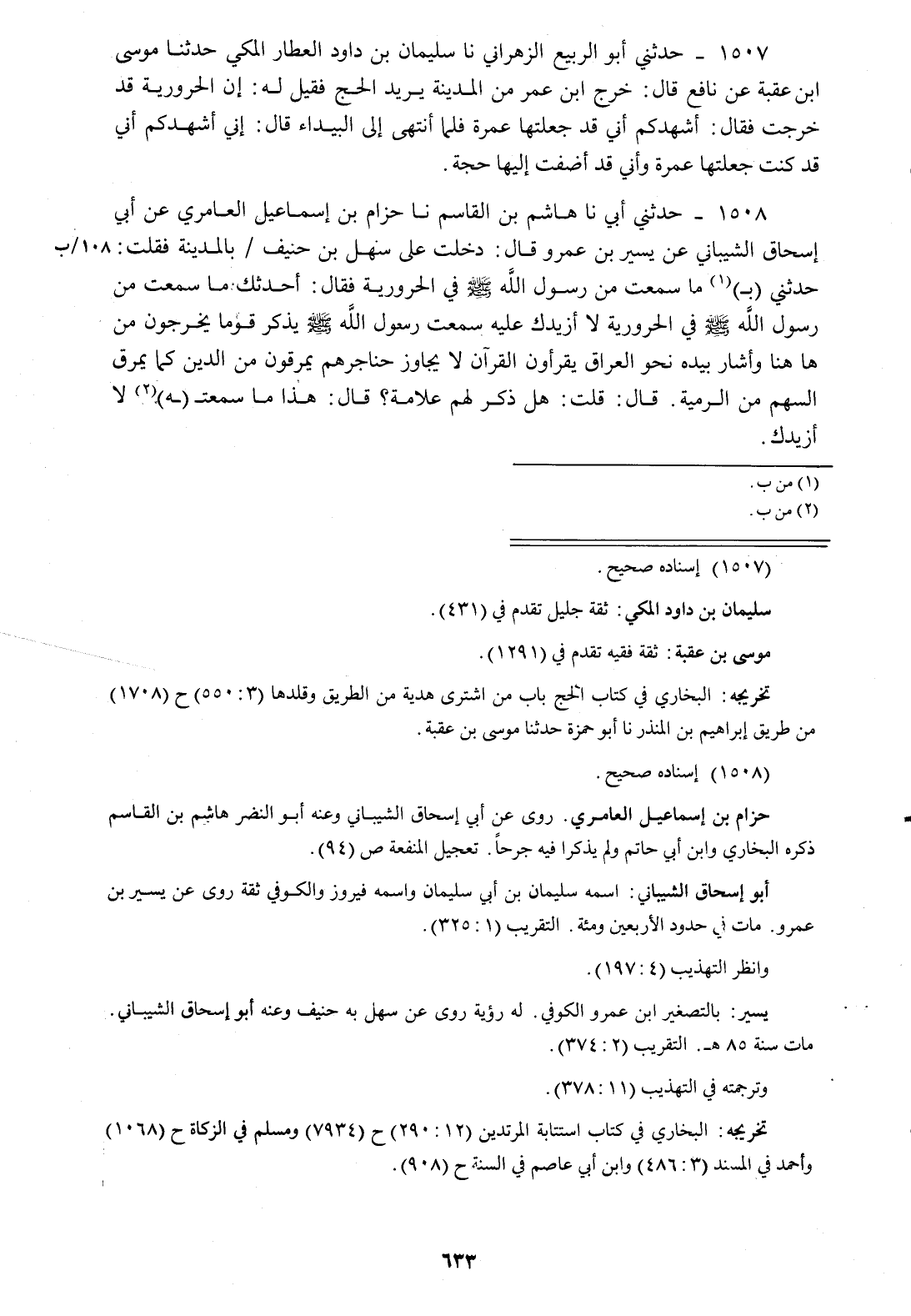 1507 - حَدَّثَنِي أَبُو الرَّبِيعِ الزَّهْرَانِيُّ، نا سُلَيْمَانُ بْنُ دَاوُدَ الْعَطَّارُ الْمَكِّيُّ، حَدَّثَنَا مُوسَى بْنُ عُقْبَةَ، عَنْ نَافِعٍ، قَالَ: خَرَجَ ابْنُ عُمَرَ مِنَ الْمَدِينَةِ يُرِيدُ الْحَجَّ فَقِيلَ لَهُ: إِنَّ الْحَرُورِيَّةَ قَدْ خَرَجَتْ. فَقَالَ: " §أُشْهِدُكُمْ أَنِّي قَدْ جَعَلْتُهَا عُمْرَةً. فَلَمَّا انْتَهَى إِلَى الْبَيْدَاءِ قَالَ: إِنِّي أُشْهِدُكُمْ أَنِّي قَدْ كُنْتُ جَعَلْتُهَا عُمْرَةً وَإِنِّي قَدْ أَضَفْتُ إِلَيْهَا حَجَّةً "