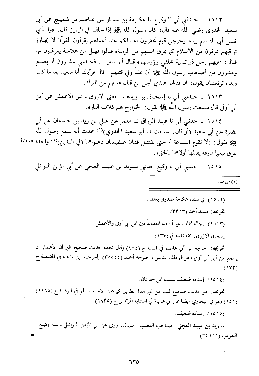 1512 - حَدَّثَنِي أَبِي، نا وَكِيعٌ، نا عِكْرِمَةُ بْنُ عَمَّارٍ، عَنْ عَاصِمِ بْنِ شُمَيْخٍ عَنْ أَبِي سَعِيدٍ الْخُدْرِيِّ رَضِيَ اللَّهُ عَنْهُ قَالَ: كَانَ رَسُولُ اللَّهِ صَلَّى اللهُ عَلَيْهِ وَسَلَّمَ إِذَا حَلَفَ فِي الْيَمِينِ قَالَ: «وَالَّذِي نَفْسُ أَبِي الْقَاسِمِ بِيَدِهِ §لَيَخْرُجَنَّ قَوْمٌ تَحْقِرُونَ أَعْمَالَكُمْ عِنْدَ أَعْمَالِهِمْ يَقْرَءُونَ الْقُرْآنَ لَا يُجَاوِزُ تَرَاقِيَهُمْ يَمْرُقُونَ مِنَ الْإِسْلَامِ كَمَا يَمْرُقُ السَّهْمُ مِنَ الرَّمِيَّةِ» قَالُوا: فَهَلْ مِنْ عَلَامَةٍ يُعْرَفُونَ بِهَا؟ قَالَ: «فِيهِمْ رَجُلٌ ذُو ثُدَيَّةٍ مُحَلِّقِي رُءُوسِهِمْ» قَالَ: أَبُو سَعِيدٍ فَحَدَّثَنِي عِشْرُونُ أَوْ بِضْعٌ وَعِشْرُونَ مِنْ أَصْحَابِ رَسُولِ اللَّهِ صَلَّى اللهُ عَلَيْهِ وَسَلَّمَ أَنَّ عَلِيًّا وَلِيَ قَتْلَهُمْ قَالَ: فَرَأَيْتُ أَبَا سَعِيدٍ بَعْدَمَا كَبِرَ وَيَدَاهُ تَرْتَعِشَانِ يَقُولُ إِنَّ قِتَالَهُمْ عِنْدِي أَجَلُّ مِنْ قِتَالِ عِدَّتِهِمْ مِنَ التُّرْكِ "