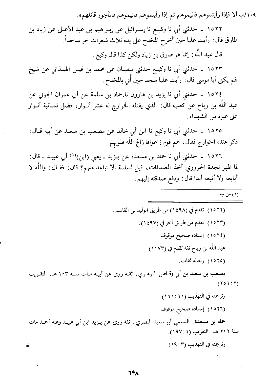 1525 - حَدَّثَنِي أَبِي، نا وَكِيعٌ، نا ابْنُ أَبِي خَالِدٍ، عَنْ مُصْعَبِ بْنِ سَعْدٍ، عَنْ أَبِيهِ، قَالَ: ذُكِرَ عِنْدَهُ §الْخَوَارِجُ فَقَالَ: «هُمْ قَوْمٌ زَاغُوا فَأَزَاغَ اللَّهُ قُلُوبَهُمْ»