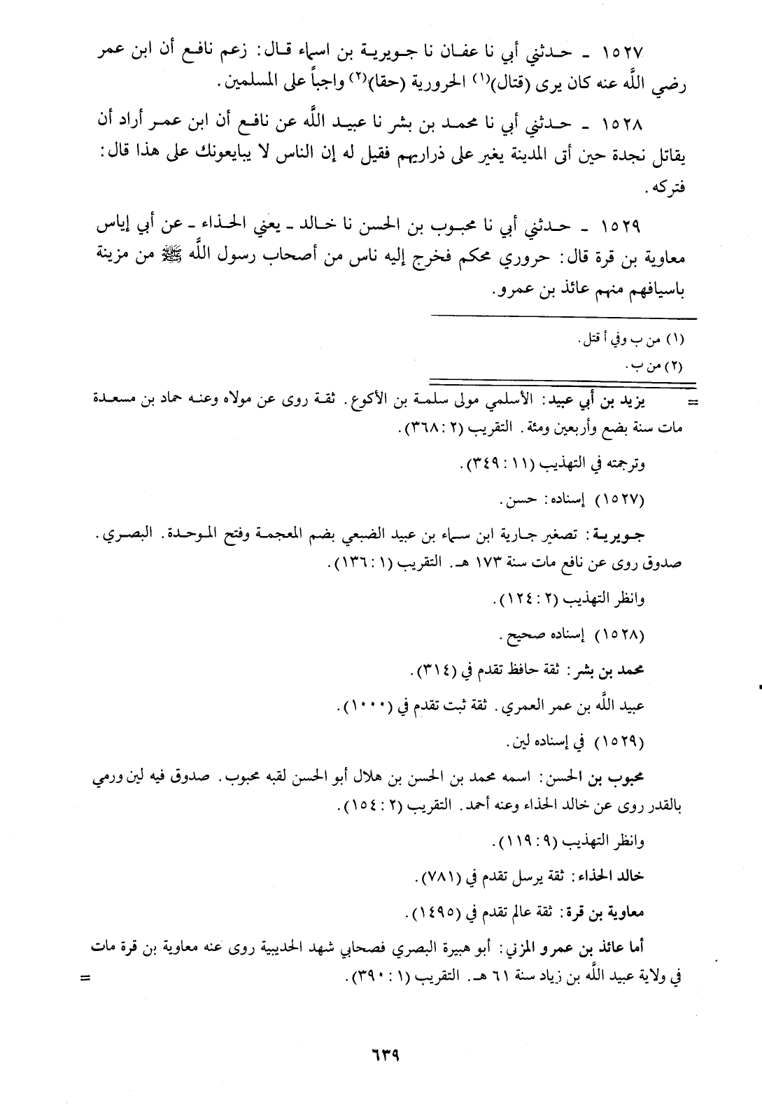 1527 - حَدَّثَنِي أَبِي، نا عَفَّانُ، نا جُوَيْرِيَةُ بْنُ أَسْمَاءَ، قَالَ: زَعَمَ نَافِعٌ أَنَّ ابْنَ عُمَرَ رَضِيَ اللَّهُ عَنْهُ كَانَ «§يَرَى قِتَالَ الْحَرُورِيَّةِ حَقًّا وَاجِبًا عَلَى الْمُسْلِمِينَ»