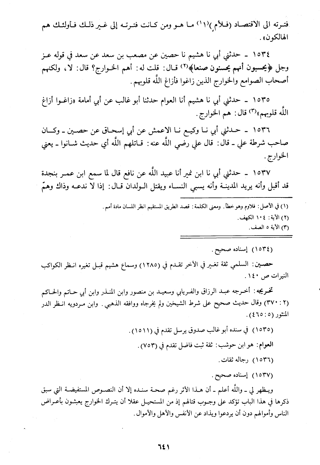 1534 - حَدَّثَنِي أَبِي، نا هُشَيْمٌ، نا حُصَيْنٌ، عَنْ مُصْعَبِ بْنِ سَعْدٍ، عَنْ سَعْدٍ، فِي قَوْلِهِ عَزَّ وَجَلَّ {يَحْسَبُونَ أَنَّهُمْ يُحْسِنُونَ صُنْعًا} [الكهف: 104] قَالَ: قُلْتُ لَهُ أَهُمُ الْخَوَارِجُ؟ قَالَ: «لَا، وَلَكِنَّهُمْ أَصْحَابُ الصَّوَامِعِ §وَالْخَوَارِجُ الَّذِينَ زَاغُوا فَأَزَاغَ اللَّهُ قُلُوبَهُمْ»