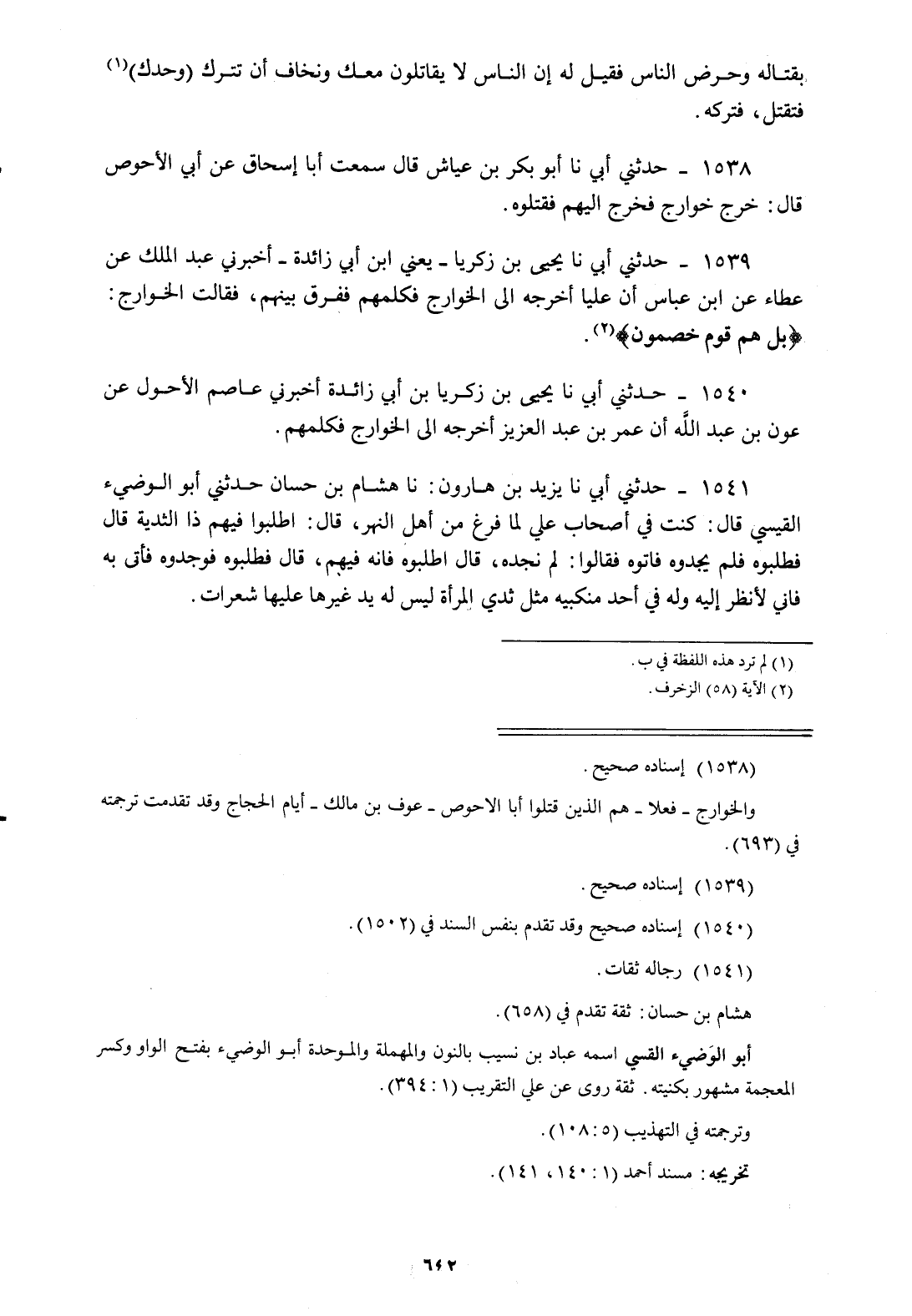 1538 - حَدَّثَنِي أَبِي، نا أَبُو بَكْرِ بْنُ عَيَّاشٍ، قَالَ: سَمِعْتُ أَبَا إِسْحَاقَ، عَنْ أَبِي الْأَحْوَصِ، قَالَ: «§خَرَجَ خَوَارِجُ فَخَرَجَ إِلَيْهِمْ فَقَتَلُوهُ»