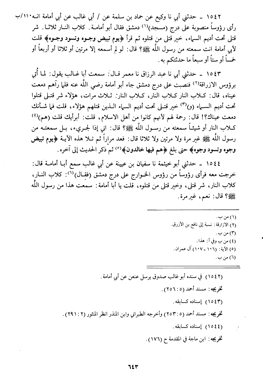 1542 - حَدَّثَنِي أَبِي، نا وَكِيعٌ، عَنْ حَمَّادِ بْنِ سَلَمَةَ، عَنْ أَبِي غَالِبٍ، عَنْ أَبِي أُمَامَةَ، إِنَّهُ رَأَى رُءُوسًا مَنْصُوبَةً عَلَى دَرَجِ مَسْجِدِ دِمَشْقَ فَقَالَ أَبُو أُمَامَةَ: «§كِلَابُ النَّارِ» ثَلَاثًا «شَرُّ قَتْلَى تَحْتِ أَدِيمِ السَّمَاءِ خَيْرُ قَتْلَى مَنْ قَتَلُوهُ» ثُمَّ قَرَأَ {يَوْمَ تَبْيَضُّ وُجُوهٌ وَتَسْوَدُّ وُجُوهٌ} [آل عمران: 106] " قُلْتُ لِأَبِي أُمَامَةَ أَنْتَ سَمِعْتَهُ مِنْ رَسُولِ اللَّهِ صَلَّى اللهُ عَلَيْهِ وَسَلَّمَ قَالَ: لَوْ لَمْ أَسْمَعْهُ إِلَّا مَرَّتَيْنِ أَوْ ثَلَاثًا أَوْ أَرْبَعًا أَوْ خَمْسًا أَوْ سِتًّا أَوْ سَبْعًا مَا حَدَّثْتُكُمْ بِهِ