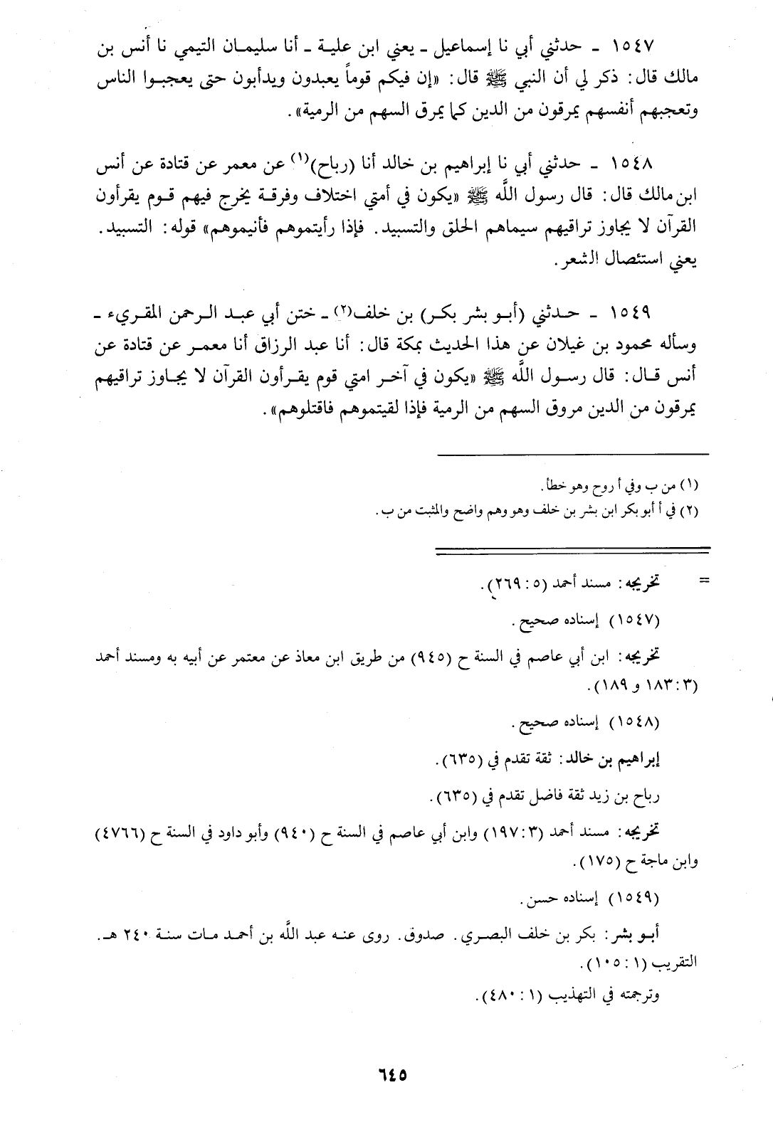 1549 - حَدَّثَنِي أَبُو بِشْرٍ بَكْرُ بْنُ خَلَفٍ خَتَنُ أَبِي عَبْدِ الرَّحْمَنِ الْمُقْرِئُ وَسَأَلَهُ مَحْمُودُ بْنُ غَيْلَانَ عَنْ هَذَا الْحَدِيثِ بِمَكَّةَ قَالَ: أَنَا عَبْدُ الرَّزَّاقِ، أَنَا مَعْمَرٌ، عَنْ قَتَادَةَ، عَنْ أَنَسٍ، قَالَ: قَالَ رَسُولُ اللَّهِ صَلَّى اللهُ عَلَيْهِ وَسَلَّمَ: «يَكُونُ فِي آخِرِ أُمَّتِي قَوْمٌ §يَقْرَءُونَ الْقُرْآنَ لَا يُجَاوِزُ تَرَاقِيَهُمْ يَمْرُقُونَ مِنَ الدِّينِ مُرُوقَ السَّهْمِ مِنَ الرَّمِيَّةِ فَإِذَا لَقِيتُمُوهُمْ فَاقْتُلُوهُمْ»