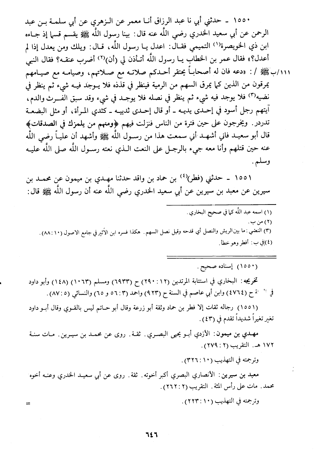 1550 - حَدَّثَنِي أَبِي، نا عَبْدُ الرَّزَّاقِ، أَنَا مَعْمَرٌ، عَنِ الزُّهْرِيِّ، عَنْ أَبِي سَلَمَةَ بْنِ عَبْدِ الرَّحْمَنِ، عَنْ أَبِي سَعِيدٍ الْخُدْرِيِّ رَضِيَ اللَّهُ عَنْهُ قَالَ: بَيْنَا رَسُولُ اللَّهِ صَلَّى اللهُ عَلَيْهِ وَسَلَّمَ يَقْسِمُ قَسْمًا إِذْ جَاءَهُ ابْنُ ذِي الْخُوَيْصِرَةِ التَّمِيمِيُّ فَقَالَ: §اعْدِلْ يَا رَسُولَ اللَّهِ. قَالَ: «وَيْلَكَ وَمَنْ يَعْدِلْ إِذَا لَمْ أَعْدِلْ؟» فَقَالَ عُمَرُ بْنُ الْخَطَّابِ: يَا رَسُولَ اللَّهِ، أَتَأْذَنُ لِي أَنْ أَضْرِبَ عُنُقَهُ. فَقَالَ النَّبِيُّ صَلَّى اللهُ عَلَيْهِ وَسَلَّمَ: " دَعْهُ فَإِنَّ لَهُ أَصْحَابًا يَحْتَقِرُ أَحَدُكُمْ صَلَاتَهُ مَعَ صَلَاتِهِمْ وَصِيَامَهُ مَعَ صِيَامِهِمْ يَمْرُقُونَ مِنَ الدِّينِ كَمَا يَمْرُقُ السَّهْمُ مِنَ الرَّمِيَّةِ فَيَنْظُرُ فِي قُذَذِهِ فَلَا يُوجَدُ فِيهِ شَيْءٌ ثُمَّ يُنْظَرُ فِي نَضِيِّهِ فَلَا يُوجَدُ فِيهِ شَيْءٌ ثُمَّ يُنْظَرُ فِي نَصْلِهِ فَلَا يُوجَدُ فِيهِ شَيْءٌ وَقَدْ سَبَقَ الْفَرْثَ وَالدَّمَ آيَتُهُمْ رَجُلٌ أَسْوَدُ فِي إِحْدَى يَدَيْهِ، أَوْ قَالَ: إِحْدَى ثَدْيَيْهِ، كَثَدْيِ الْمَرْأَةِ، أَوْ مِثْلُ الْبَضْعَةِ، تَدَرْدَرُ وَيَخْرُجُونَ عَلَى حِينِ فَتْرَةٍ مِنَ النَّاسِ " فَنَزَلَتْ فِيهِمْ {وَمِنْهُمْ مَنْ يَلْمِزُكَ فِي الصَّدَقَاتِ} [التوبة: 58] قَالَ أَبُو سَعِيدٍ: فَإِنِّي أَشْهَدُ أَنِّي سَمِعْتُ هَذَا مِنْ رَسُولِ اللَّهِ صَلَّى اللهُ عَلَيْهِ وَسَلَّمَ وَأَشْهَدُ أَنَّ عَلِيًّا رَضِيَ اللَّهُ عَنْهُ حِينَ قَتَلَهُمْ وَأَنَا مَعَهُ جِيءَ بِالرَّجُلِ عَلَى النَّعْتِ الَّذِي نَعَتَهُ رَسُولُ اللَّهِ صَلَّى اللهُ عَلَيْهِ وَسَلَّمَ