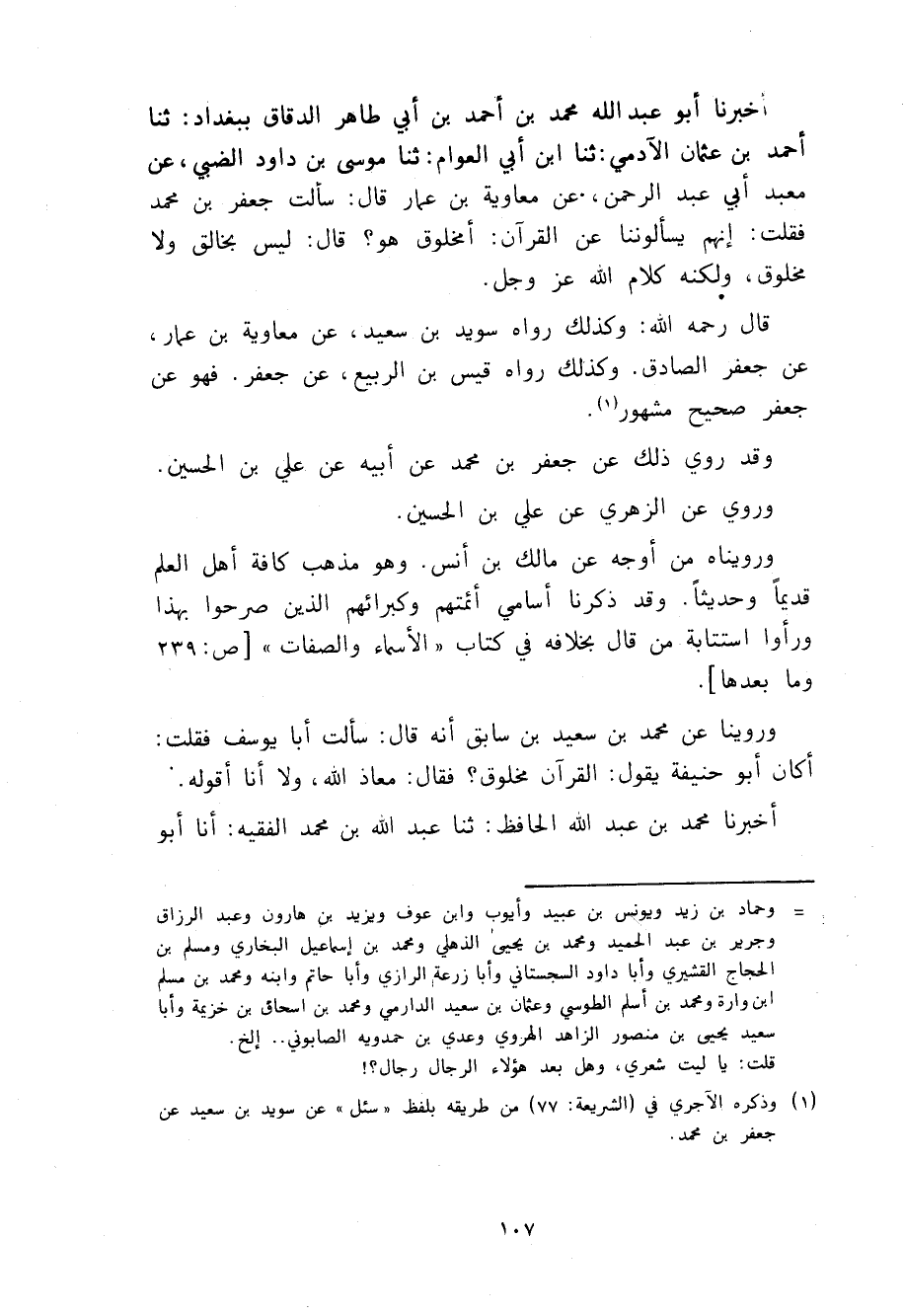 أَخْبَرَنَا أَبُو عَبْدِ اللَّهِ مُحَمَّدُ بْنُ أَحْمَدَ بْنِ أَبِي طَاهِرٍ الدَّقَّاقُ بِبَغْدَادَ، ثنا أَحْمَدُ بْنُ عُثْمَانَ الْآدَمِيُّ، ثنا ابْنُ أَبِي الْعَوَّامِ، ثنا مُوسَى بْنُ دَاوُدَ الضَّبِّيُّ، عَنْ مَعْبَدٍ أَبِي عَبْدِ الرَّحْمَنِ، عَنْ مُعَاوِيَةَ بْنِ عَمَّارٍ، قَالَ: سَمِعْتُ جَعْفَرَ بْنَ مُحَمَّدٍ فَقُلتُ: إِنَّهُمْ يَسْأَلُونَنَا عَنِ الْقُرْآنِ، أَمَخْلُوقٌ هُوَ؟ قَالَ: §لَيْسَ بِخَالِقٍ وَلَا مَخْلُوقٍ، وَلَكِنَّهُ كَلَامُ اللَّهِ عَزَّ وَجَلَّ قَالَ رَحِمَهُ اللَّهُ: وَكَذَلِكَ رَوَاهُ سُوَيْدُ بْنُ سَعِيدٍ، عَنْ مُعَاوِيَةَ بْنِ عَمَّارٍ، عَنْ جَعْفَرٍ الصَّادِقِ، وَكَذَلِكَ رَوَاهُ قَيْسُ بْنُ الرَّبِيعِ، عَنْ جَعْفَرٍ، فَهُوَ عَنْ جَعْفَرٍ صَحِيحٌ مَشْهُورٌ. وَقَدْ رُوِيَ ذَلِكَ عَنْ جَعْفَرِ بْنِ مُحَمَّدٍ، عَنْ أَبِيهِ، عَنْ عَلِيِّ بْنِ الْحُسَيْنِ. وَرُوِيَ عَنِ الزُّهْرِيِّ، عَنْ عَلِيِّ بْنِ الْحُسَيْنِ، وَرُوِّينَاهُ مِنْ أَوجُهٍ عَنْ مَالِكِ بْنِ أَنَسٍ، وَهُوَ مَذْهَبُ كَافَّةِ أَهْلِ الْعِلْمِ قَدِيمًا وَحَدِيثًا. وَقَدْ ذَكَرْنَا أَسَامِيَ أَئِمَّتِهِمْ وَكُبَرَائِهِمُ الَّذِينَ صَرَّحُوا بِهَذَا وَرَأَوُا اسْتِتَابَةَ مَنْ قَالَ بِخِلَافِهِ فِي كِتَابِ الْأَسْمَاءِ وَالصِّفَاتِ، وَرُوِّينَا عَنْ مُحَمَّدِ بْنِ سَعِيدِ بْنِ سَابِقٍ أَنَّهُ قَالَ: سَأَلْتُ أَبَا يُوسُفَ فَقُلْتُ: أَكَانَ أَبُو حَنِيفَةَ يَقُولُ: الْقُرْآنُ مَخْلُوقٌ. فَقَالَ: مَعَاذَ اللَّهِ، وَلَا أَنَا أَقُوُلُهُ