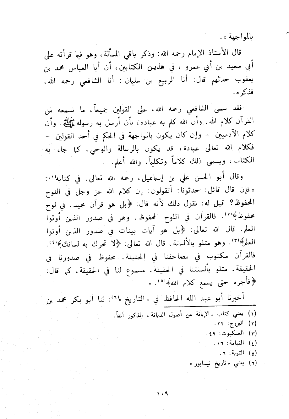 أَخْبَرَنَا أَبُو عَبْدِ اللَّهِ الْحَافِظُ، فِي التَّارِيخِ، ثنا أَبُو بَكْرٍ مُحَمَّدُ بْنُ -[110]- أَبِي الْهَيْثَمِ الْمُطَوَّعِيُّ بِبُخَارَى، ثنا مُحَمَّدُ بْنُ يُوسُفَ الْفَرْبَرِيُّ، قَالَ: سَمِعْتُ أَبَا عَبْدِ اللَّهِ مُحَمَّدَ بْنَ إِسْمَاعِيلَ الْبُخَارِيَّ يَقُولُ: سَمِعْتُ عُبَيْدَ اللَّهِ بْنَ سَعِيدٍ يَعْنِي أَبَا قُدَامَةَ، يَقُولُ: سَمِعْتُ يَحْيَى بْنَ سَعِيدٍ يَعْنِي الْقَطَّانَ، يَقُولُ: مَا زِلْتُ أَسْمَعُ أَصْحَابَنَا يَقُولُونَ: §أَفْعَالُ الْعِبَادِ مَخْلُوقَةٌ قَالَ أَبُو عَبْدِ اللَّهِ الْبُخَارِيُّ: حَرَكَاتُهُمْ وَأَصْوَاتُهُمْ وَاكْتِسَابُهُمْ وَكِتَابَتُهُمْ مَخْلُوقَةٌ، فَأَمَّا الْقُرْآنُ الْمَتْلُوُّ الْمُبَيَّنُ الْمُثْبَتُ فِي الْمَصَاحِفِ الْمَسْطُورُ الْمَكْتُوبُ الْمُوعَى فِي الْقُلُوبِ فَهُوَ كَلَامُ اللَّهِ لَيْسَ بِمَخْلُوقٍ، قَالَ اللَّهُ عَزَّ وَجَلَّ {بَلْ هُوَ آيَاتٌ بَيِّنَاتٌ فِي صُدُورِ الَّذِينَ أُوتُوا الْعِلْمَ} [العنكبوت: 49] . قَالَ الشَّيْخُ الْأُسْتَاذُ الْإِمَامُ رَحِمَهُ اللَّهُ: وَهَذَا الْقَوْلُ لَا يُخَالِفُ قَوْلَ أَحْمَدَ بْنِ حَنْبَلٍ رَحِمَهُ اللَّهُ. وَقَدْ رَوَيْنَا عَنْهُ فِي كِتَابِ الْأَسْمَاءِ وَالصِّفَاتِ أَنَّهُ أَنْكَرَ عَلَى تِلْمِيذِهِ أَبِي طَالِبٍ قَوْلَهُ: لَفْظِي بِالْقُرْآنِ غَيْرُ مَخْلُوقٍ، وَكَرِهَ الْكَلَامَ فِي اللَّفْظِ