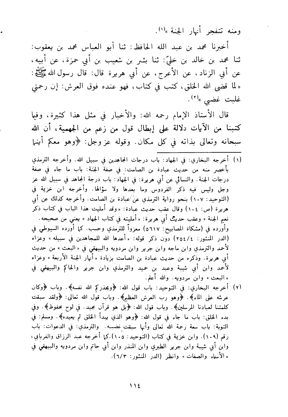 أَخْبَرَنَا مُحَمَّدُ بْنُ عَبْدِ اللَّهِ الْحَافِظُ، ثنا أَبُو الْعَبَّاسِ مُحَمَّدُ بْنُ يَعْقُوبَ، ثنا مُحَمَّدُ بْنُ خَالِدِ بْنِ خُلَيٍّ، ثنا بِشْرُ بْنُ شُعَيْبِ بْنِ أَبِي حَمْزَةَ، عَنْ أَبِيهِ، عَنْ أَبِي الزِّنَادِ، عَنِ الْأَعْرَجِ، عَنْ أَبِي هُرَيْرَةَ، قَالَ: قَالَ رَسُولُ اللَّهِ صَلَّى اللهُ عَلَيْهِ وَسَلَّمَ: §" لَمَّا قَضَى اللَّهُ الْخَلْقَ كَتَبَ فِي كِتَابٍ فَهُوَ عِنْدَهُ فَوْقَ الْعَرْشِ: إِنَّ رَحْمَتِي غَلَبَتْ غَضَبِي " قَالَ الْأُسْتَاذُ الْإِمَامُ رَحِمَهُ اللَّهُ: وَالْأَخْبَارُ فِي مِثْلِ هَذَا كَثِيرَةٌ، وَفِيمَا كَتَبْنَا مِنَ الْآيَاتِ دَلَالَةٌ عَلَى إِبْطَالِ قَوْلِ مَنْ زَعَمَ مِنَ الْجَهْمِيَّةِ أَنَّ اللَّهَ سُبْحَانَهُ وَتَعَالَى بِذَاتِهِ فِي كُلِّ مَكَانٍ، وَقَوْلُهُ عَزَّ وَجَلَّ {وَهُوَ مَعَكُمْ أَيْنَ مَا -[115]- كُنْتُمْ} [الحديد: 4] ، إِنَّمَا أَرَادَ بِهِ بِعِلْمِهِ لَا بِذَاتِهِ، ثُمَّ الْمَذْهبُ الصَّحِيحُ فِي جَمِيعِ ذَلِكَ الِاقْتِصَارُ عَلَى مَا وَرَدَ بِهِ التَّوْقِيفُ دُونَ التَّكْيِيفِ. وَإِلَى هَذَا ذَهَبَ الْمُتَقَدِّمُونَ مِنْ أَصْحَابِنَا وَمَنْ تَبِعَهُمْ مِنَ الْمُتَأَخِّرِينَ وَقَالُوا: الِاسْتِوَاءُ عَلَى الْعَرْشِ قَدْ نَطَقَ بِهِ الْكِتَابُ فِي غَيْرِ آيَةٍ، وَوَرَدَتْ بِهِ الْأَخْبَارُ الصَّحِيحَةُ، فَقَبُولُهُ مِنْ جِهَةِ التَّوْقِيفِ وَاجِبٌ، وَالْبَحْثُ عَنْهُ وَطَلَبُ الْكَيْفِيَّةِ لَهُ غَيْرُ جَائِزٍ