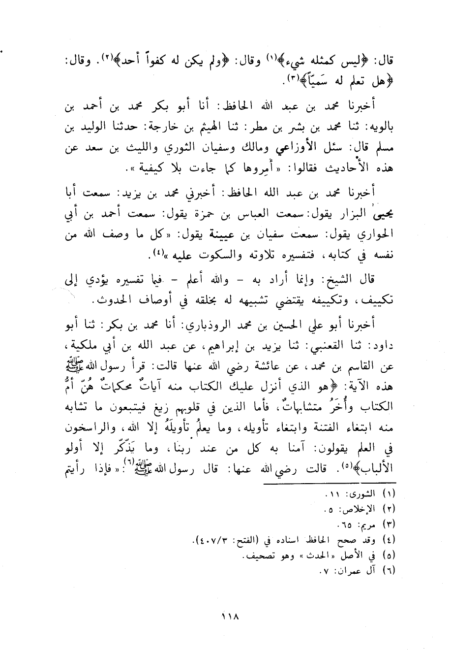 أَخْبَرَنَا مُحَمَّدُ بْنُ عَبْدِ اللَّهِ الْحَافِظُ، أَخْبَرَنِي مُحَمَّدُ بْنُ يَزِيدَ، سَمِعْتُ أَبَا يَحْيَى الْبَزَّارَ، يَقُولُ: سَمِعْتُ الْعَبَّاسَ بْنَ حَمْزَةَ، يَقُولُ: سَمِعْتُ أَحْمَدَ بْنَ أَبِي الْحَوَارِي، يَقُولُ: سَمِعْتُ سُفْيَانَ بْنَ عُيَيْنَةَ، يَقُولُ: §كُلُّ مَا وَصَفُ اللَّهُ مِنْ نَفْسِهِ فِي كِتَابِهِ فَتَفْسيرُهُ تِلَاوَتُهُ وَالسُّكُوتُ عَلَيْهِ قَالَ الشَّيْخُ: وَإِنَّمَا أَرَادَ بِهِ وَاللَّهُ أَعْلَمُ فِيمَا تَفْسِيرُهُ يُؤَدِّي إِلَى تَكْيِيفٍ، وَتَكْيِيفُهُ يَقْتَضِي تَشْبِيهًا لَهُ بِخَلْقِهِ فِي أَوْصَافِ الْحَدَثِ