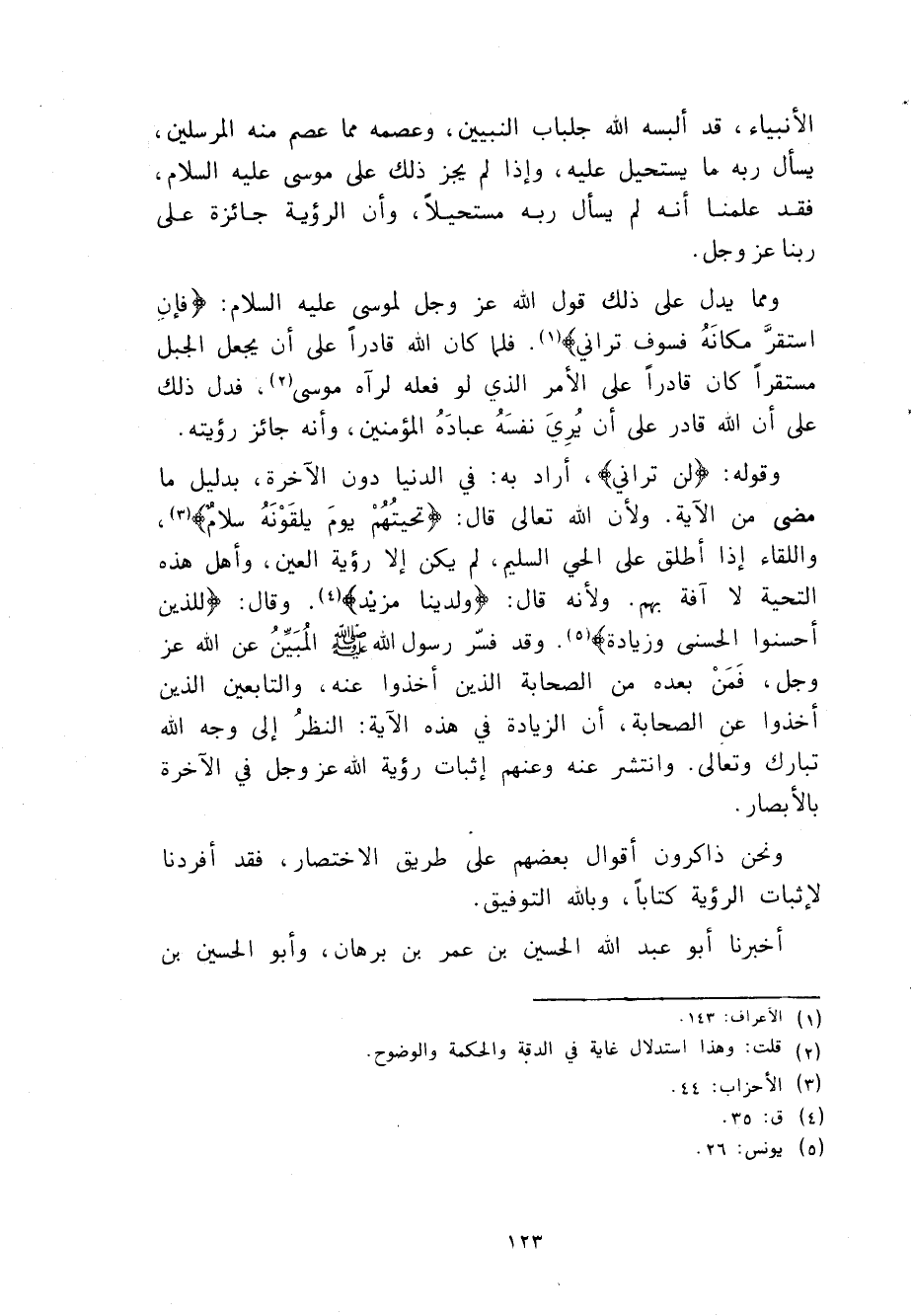 الْأَنْبِيَاءِ، قَدْ أَلْبَسَهُ اللَّهُ جِلبَابَ النَّبِيِّينَ وَعَصَمَهُ مِمَّا عَصَمَ مِنْهُ الْمُرْسَلِينَ، يَسْأَلُ رَبَّهُ مَا يَسْتَحِيلُ عَلَيْهِ، وَإِذَا لَمْ يَجُزْ ذَلِكَ عَلَى مُوسَى عَلَيْهِ السَّلَامُ فَقَدْ عَلِمْنَا أَنَّهُ لَمْ يَسْأَلْ رَبَّهُ مُسْتَحِيلًا، وَأَنَّ الرُّؤْيَةَ جَائِزَةٌ عَلَى رَبِّنَا عَزَّ وَجَلَّ، وَمِمَّا يَدُلُّ عَلَى ذَلِكَ قَوْلُ اللَّهِ عَزَّ وَجَلَّ لِمُوسَى عَلَيْهِ السَّلَامُ: {فَإِنِ اسْتَقَرَّ مَكَانَهُ فَسَوْفَ تَرَانِي} [الأعراف: 143] ، فَلمَّا كَانَ اللَّهُ قَادِرًا عَلَى أَنْ يَجْعَلَ الْجَبَلَ مُستَقِرًّا كَانَ قَادِرًا عَلَى الْأَمْرِ الَّذِي لَوْ فَعَلَهُ لَرَآهُ مُوسَى، فَدَلَّ ذَلِكَ عَلَى أَنَّ اللَّهَ قَادِرٌ عَلَى أَنْ يُرِيَ نَفْسَهُ عِبَادَهُ الْمُؤْمِنِينَ، وَأَنَّهُ جَائِزٌ رُؤْيَتُهُ، وَقَوْلُهُ: {لَنْ تَرَانِي} [الأعراف: 143] أَرَادَ بِهِ فِي الدُّنْيَا دُونَ الْآخِرَةِ بِدَلِيلِ مَا مَضَى مِنَ الْآيَةِ؛ وَلِأَنَّ اللَّهَ تَعَالَى قَالَ: {تَحِيَّتُهُمْ يَوْمَ يَلْقوْنَهُ سَلَامٌ} [الأحزاب: 44] ، وَاللِّقَاءُ إِذَا أُطْلِقَ عَلَى الْحَيِّ السَّلِيمِ لَمْ يَكُنْ إِلَّا رُؤْيَةَ الْعَيْنِ، وَأَهْلُ هَذِهِ التَّحِيَّةِ لَا آفَةَ بِهِمْ؛ وَلِأَنَّهُ قَالَ: {وَلَدَيْنَا مَزِيدٌ} [ق: 35] ، وَقَالَ: {لِلَّذِينَ أَحْسَنُوا الْحُسْنَى وَزِيَادَةٌ} [يونس: 26] . وَقَدْ فَسَّرَ رَسُولُ اللَّهِ صَلَّى اللهُ عَلَيْهِ وَسَلَّمَ الْمُبَيِّنُ عَنِ اللَّهِ عَزَّ وَجَلَّ، فَمَنْ بَعْدَهُ مِنَ الصَّحَابَةِ الَّذِينَ أَخَذُوا عَنْهُ، وَالتَّابِعِينَ الَّذِينَ أَخَذُوا عَنِ الصَّحَابَةِ أَنَّ الزِّيَادَةَ فِي هَذِهِ الْآيَةِ النَّظَرُ إِلَى وَجْهِ اللَّهِ تَبَارَكَ وَتَعَالَى، وَانْتَشَرَ عَنْهُ وَعَنْهُمْ إِثْبَاتُ رُؤْيَةِ اللَّهِ عَزَّ وَجَلَّ فِي الْآخِرَةِ بِالْأَبْصَارِ، وَنَحْنُ ذَاكِرُونَ أَقْوَالَ بَعْضِهِمْ عَلَى طَرِيقِ الِاخْتِصَارِ، فَقَدْ أَفْرَدْنَا لِإِثْبَاتِ الرُّؤْيَةِ كِتَابًا، وَبِاللَّهِ التَّوْفِيقُ