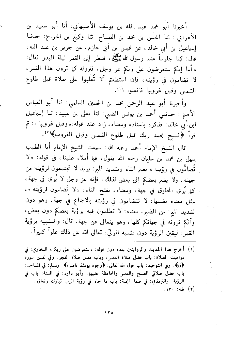 أَخْبَرَنَا أَبُو مُحَمَّدٍ عَبْدُ اللَّهِ بْنُ يُوسُفَ الْأَصْبَهَانِيُّ، أنا أَبُو سَعِيدِ بْنُ الْأَعْرَابِيِّ، ثنا الْحَسَنُ بْنُ مُحَمَّدِ بْنِ الصَّبَّاحِ، ثنا وَكِيعُ بْنُ الْجَرَّاحِ، حَدَّثَنَا إِسْمَاعِيلُ بْنُ أَبِي خَالِدٍ، عَنْ قَيْسِ بْنِ أَبِي حَازِمٍ، عَنْ جَرِيرِ بْنِ عَبْدِ اللَّهِ، قَالَ: " كُنَّا جُلُوسًا عِنْدَ رَسُولِ اللَّهِ صَلَّى اللهُ عَلَيْهِ وَسَلَّمَ فَنَظَرَ إِلَى الْقَمَرِ لَيْلَةَ الْبَدْرِ فَقَالَ: أَمَا إِنَّكُمْ §سَتُعْرَضُونَ عَلَى رَبِّكُمْ عَزَّ وَجَلَّ فَتَرَوْنَهُ كَمَا تَرَوْنَ هَذَا الْقَمَرَ لَا تُضَامُونَ فِي رُؤْيَتِهِ فَإِنِ اسْتَطَعْتُمْ أَنْ لَا تُغْلَبُوا عَلَى صَلَاةٍ قَبْلَ طُلُوعِ الشَّمْسِ وَقَبْلَ غُرُوبِهَا فَافْعَلُوا «وَأَخْبَرَنَا أَبُو عَبْدِ الرَّحْمَنِ مُحَمَّدُ بْنُ الْحُسَيْنِ السُّلَمِيُّ، ثنا أَبُو الْعَبَّاسِ الْأَصَمُّ، حَدَّثَنِي أَحْمَدُ بْنُ يُونُسَ الضَّبِّيُّ، ثنا يَعْلَى بْنُ عُبَيْدٍ، ثنا إِسْمَاعِيلُ بْنُ أَبِي خَالِدٍ، فَذَكَرَهُ بِإِسْنَادِهِ وَمَعْنَاهُ، زَادَ عِنْدَ قَوْلِهِ» وَقَبْلَ غُرُوبِهَا " ثُمَّ قَرَأَ {وَسَبِّحْ بِحَمْدِ ربِّكَ قَبْلَ طُلُوعِ الشَّمْسِ وَقَبْلَ الْغُرُوبِ} [ق: 39] قَالَ الشَّيْخُ الْإِمَامُ أَحْمَدُ رَحِمَهُ اللَّهُ: سَمِعْتُ الشَّيْخَ الْإِمَامَ أَبَا الطَّيِّبِ سَهْلَ بْنَ مُحَمَّدِ بْنِ سُلَيْمَانَ رَحِمَهُ اللَّهُ يَقُولُ فِيمَا أَمْلَاهُ عَلَيْنَا فِي قَوْلِهِ: لَا تُضَامُّونَ فِي رُؤْيَتِهِ بِضَمِّ التَّاءِ وَتشْدِيدِ الْمِيمِ يُرِيدُ لَا تَجْتَمِعُونَ لِرُؤْيَتِهِ مِنْ جِهَتِهِ، وَلَا يُضَمُّ بَعْضُكُمْ إِلَى بَعْضٍ لِذَلِكَ فَإِنَّهُ عَزَّ وَجَلَّ لَا يُرَى فِي جِهَةٍ كَمَا يُرَى الْمَخْلُوقُ فِي جِهَةٍ وَمَعْنَاهُ بِفَتحِ التَّاءِ لَا تُضَامُونَ لِرُؤْيَتِهِ مِثْلَ مَعْنَاهُ بِضَمِّهَا، لَا تُضَامُونَ فِي رُؤْيَتِهِ بِالِاجْتِمَاعِ فِي جِهَةٍ وَهُوَ دُونَ تَشْدِيدِ الْمِيمِ مِنَ الضَّيْمِ مَعْنَاهُ: لَا تُظْلَمُونَ فِي رُؤْيَتِهِ بِرُؤْيَةِ بَعْضِكُمْ دُونَ بَعْضٍ وَأَنَّكُمْ تَرَوْنَهُ فِي جِهَاتِكُمْ كَلِّهَا وَهُوَ يَتَعَالَى عَنْ جِهَةٍ، قَالَ: وَالتَّشْبِيهُ بِرُؤْيَةِ الْقَمَرِ لِيَقِينِ الرُّؤْيَةِ دُونَ تَشْبِيهِ الْمَرْئِيِّ، تَعَالَى اللَّهُ عَنْ ذَلِكَ عُلُوًّا كَبِيرًا