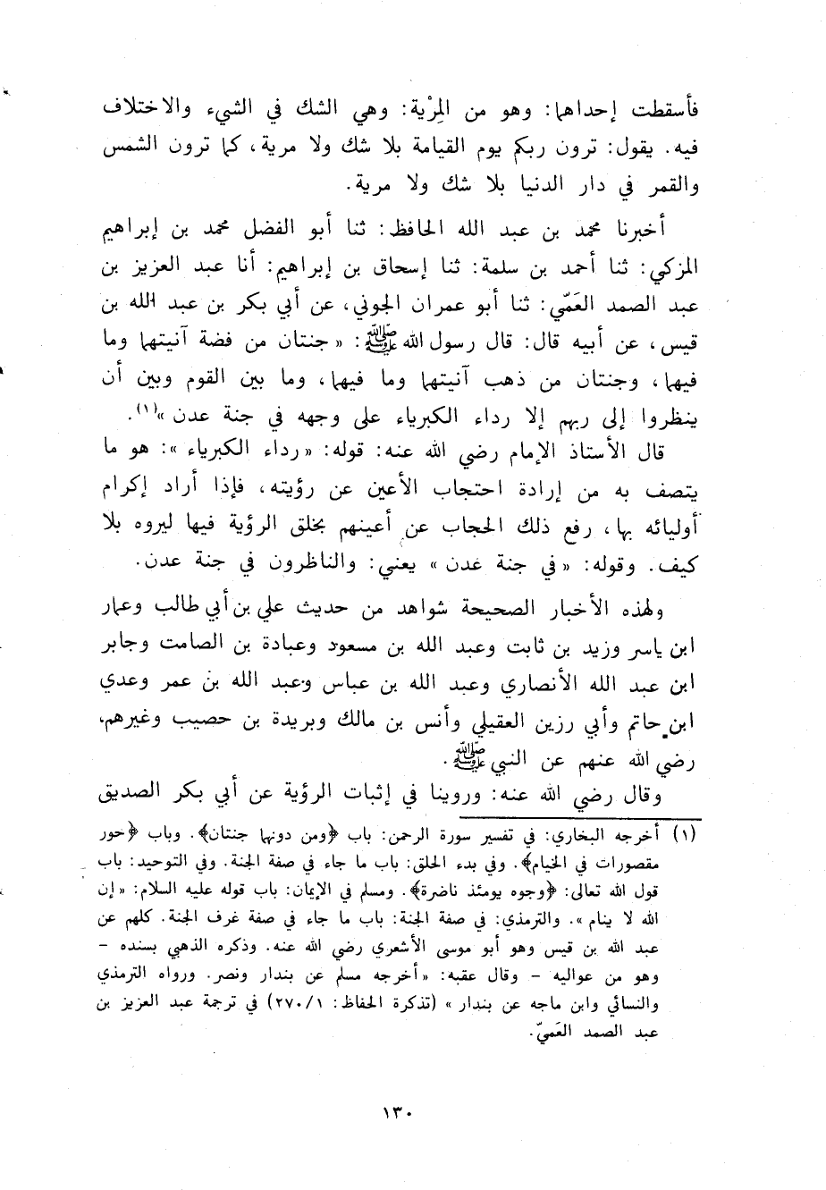 أَخْبَرَنَا مُحَمَّدُ بْنُ عَبْدِ اللَّهِ الْحَافِظُ، ثنا أَبُو الْفَضْلِ مُحَمَّدُ بْنُ إِبْرَاهِيمَ الْمُزَكِّي، ثنا أَحْمَدُ بْنُ سَلَمَةَ، ثنا إِسْحَاقُ بْنُ إِبْرَاهِيمَ، أنا عَبْدُ الْعَزِيزِ بْنُ عَبْدِ الصَّمَدِ الْعَمِيُّ، ثنا أَبُو عِمْرَانَ الْجَوْنِيُّ، عَنْ أَبِي بَكْرِ بْنِ عَبْدِ اللَّهِ بْنِ قَيْسٍ، عَنْ أَبِيهِ قَالَ: قَالَ رَسُولُ اللَّهِ صَلَّى اللهُ عَلَيْهِ وَسَلَّمَ: «§جَنَّتَانِ مِنْ فِضَّةٍ آنِيَتُهُمَا وَمَا فِيهِمَا، وَجَنَّتَانِ مِنْ ذَهَبٍ آنِيَتُهُمَا وَمَا فِيهِمَا وَمَا بَيْنَ الْقَوْمِ وَبَيْنَ أَنْ يَنْظُرُوا إِلَى رَبِّهِمْ إِلَّا رِدَاءُ الْكِبْرِيَاءِ عَلَى وَجْهِهِ فِي جَنَّةِ عَدْنٍ» قَالَ الْأُسْتَاذُ الْإِمَامُ رَضِيَ اللَّهُ عَنْهُ: قَوْلُهُ «رِدَاءُ الْكِبْرِيَاءِ» هُوَ مَا يَتَّصِفُ بِهِ مِنْ إِرَادَةِ احْتِجَابِ الْأَعْيُنِ، عَنْ رُؤْيَتِهِ فَإِذَا أَرَادَ إِكْرَامَ أَوْلِيَائِهِ بِهَا رَفَعَ ذَلِكَ الْحِجَابَ عَنْ أَعْيُنِهِمْ بِخَلْقِ الرُّؤْيَةِ فِيهَا لِيَرَوهُ بِلَا كَيْفٍ، كَمَا عَرَفُوهُ بِلَا كَيْفٍ، وَقَوْلُهُ «فِي جَنَّاتِ عَدْنٍ» يَعْنِي: وَالنَّاظِرُونَ فِي جَنَّاتِ عَدْنٍ " وَلِهَذِهِ الْأَخْبَارِ الصَّحِيحَةِ شَوَاهِدُ مِنْ حَدِيثِ عَلِيِّ بْنِ أَبِي طَالِبٍ، وَعَمَّارِ بْنِ يَاسِرٍ، وَزَيْدِ بْنِ ثَابِتٍ، وَعَبْدِ اللَّهِ بْنِ مَسْعُودٍ، وَعُبَادَةَ بْنِ الصَّامتِ، وَجَابرِ بْنِ عَبْدِ اللَّهِ الْأَنْصَارِيِّ، وَعَبْدِ اللَّهِ بْنِ عَبَّاسٍ، وَعَبْدِ اللَّهِ بْنِ عُمَرَ، وَعَدِيِّ بْنِ حَاتِمٍ، وَأَبِي رَزِينٍ الْعُقَيْلِيِّ، وَأَنَسِ بْنِ مَالِكٍ، وَبُرَيْدَةَ بْنِ حُصَيْبٍ وَغَيْرِهِمْ رَضِيَ اللَّهُ عَنْهُمْ، عَنِ النَّبِيِّ صَلَّى اللهُ عَلَيْهِ وَسَلَّمَ، وَقَالَ رَضِيَ اللَّهُ عَنْهُ وَرُوِّينَا فِي إِثْبَاتِ الرُّؤْيَةِ عَنْ أَبِي بَكْرٍ الصِّدِّيقِ -[131]- رَضِيَ اللَّهُ عَنْهُ، وَحُذَيْفَةَ بْنِ الْيَمَانِ، وَعَبْدِ اللَّهِ بْنِ مَسْعُودٍ، وَعَبْدِ اللَّهِ بْنِ عَبَّاسٍ، وَأَبِي مُوسَى وَغَيْرِهِمْ رَضِيَ اللَّهُ عَنْهُمْ، وَلَمْ يُرْوَ عَنْ أَحَدٍ مِنْهُمْ نَفْيُهَا، وَلَوْ كَانُوا فِيهِ مُخْتَلِفِينَ لَنُقِلَ اخْتِلَافُهُمْ إِلَيْنَا، وَكَمَا أَنَّهُمْ لَمَّا اخْتَلَفُوا فِي الْحَلَالِ وَالْحَرَامِ وَالشَّرَائِعِ وَالْأَحْكَامِ نُقِلَ اخْتِلَافُهُمْ فِي ذَلِكَ إِلَيْنَا، وَكَمَا أَنَّهُمْ لَمَّا اخْتَلَفُوا فِي رُؤْيَتِهِ بِالْأَبْصَارِ فِي الدُّنْيَا نُقِلَ اخْتِلَافُهُمْ فِي ذَلِكَ إِلَيْنَا فَلَمَّا نُقِلَتْ رُؤْيَةُ اللَّهِ بِالْأَبْصَارِ عَنْهُمْ فِي الْآخِرَةِ وَلَمْ يُنْقَلْ عَنْهُمْ فِي ذَلِكَ اخْتِلَافٌ يَعْنِي فِي الْآخِرَةِ كَمَا نُقِلَ عَنْهُمْ فِيهَا اخْتِلَافٌ فِي الدُّنْيَا عَلِمْنَا أَنَّهُمْ كَانُوا عَلَى الْقَوْلِ بِرُؤْيَةِ اللَّهِ بِالْأَبْصَارِ فِي الْآخِرَةِ مُتَّفِقِينَ مُجْتَمِعِينَ وَبِاللَّهِ التَّوْفِيقُ