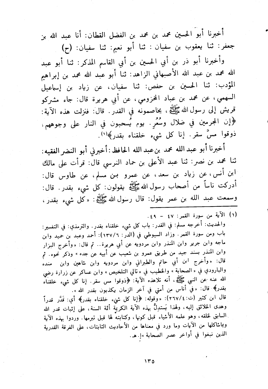 أَخْبَرَنَا أَبُو الْحُسَيْنِ مُحَمَّدُ بْنُ مُحَمَّدِ بْنِ الْفَضْلِ الْقَطَّانُ، أنا عَبْدُ اللَّهِ بْنُ جَعْفَرٍ، ثنا يَعْقُوبُ بْنُ سُفْيَانَ، ثنا أَبُو نُعَيْمٍ، ثنا سُفْيَانُ وَأَخْبَرَنَا أَبُو ذَرِّ بْنُ أَبِي الْحُسَيْنِ بْنِ أَبِي الْقَاسِمِ الْمُذَكِّرُ، ثنا أَبُو عَبْدِ اللَّهِ مُحَمَّدُ بْنُ عَبْدِ اللَّهِ الْأَصْبَهَانِيُّ الزَّاهِدُ، ثنا أَبُو عَبْدِ اللَّهِ مُحَمَّدُ بْنُ إِبْرَاهِيمَ الْمُؤَدِّبُ، ثنا الْحُسَيْنُ بْنُ حَفْصٍ، ثنا سُفْيَانُ، عَنْ زِيَادِ بْنِ إِسْمَاعِيلَ السَّهْمِيِّ، عَنْ مُحَمَّدِ بْنِ عَبَّادٍ الْمَخْزُومِيِّ، عَنْ أَبِي هُرَيْرَةَ، قَالَ: جَاءَ مُشْرِكُو قُرَيْشٍ إِلَى رَسُولِ اللَّهِ صَلَّى اللهُ عَلَيْهِ وَسَلَّمَ يُخَاصِمُونَهُ فِي الْقَدَرِ قَالَ: فَنَزَلَتْ هَذِهِ الْآيَةُ {إِنَّ §الْمُجْرِمِينَ فِي ضَلَالٍ وَسُعُرٍ يَوْمَ يُسْحَبُونَ فِي النَّارِ عَلَى وُجُوهِهِمْ ذُوقُوا مَسَّ سَقَرٍ إِنَّا كُلَّ شَيْءٍ خَلَقْنَاهُ بِقَدَرٍ} [القمر: 48]