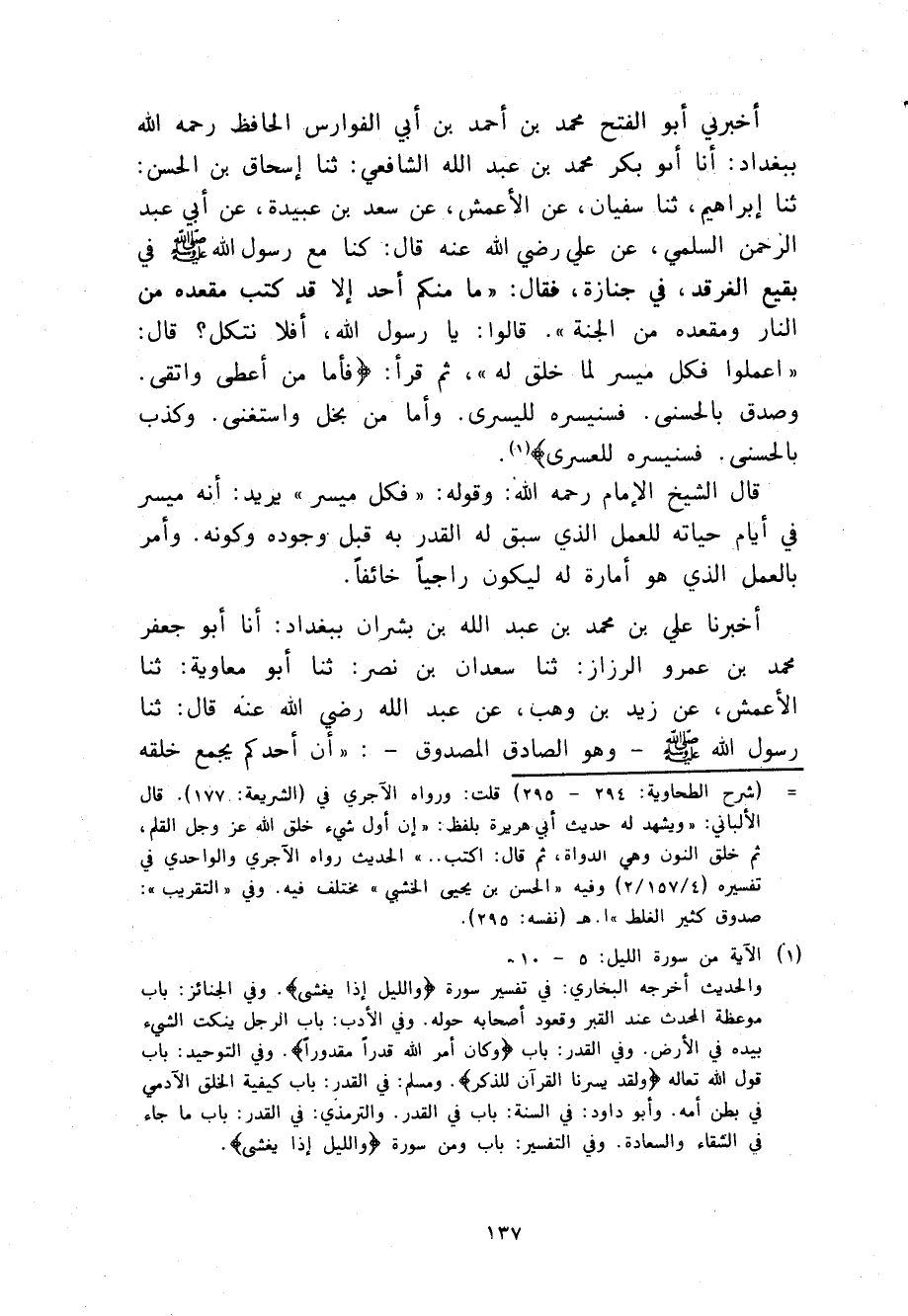 أَخْبَرَنَا أَبُو الْفَتْحِ مُحَمَّدُ بْنُ أَحْمَدَ بْنِ أَبِي الْفَوَارِسِ الْحَافِظُ رَحِمَهُ اللَّهُ بِبَغْدَادَ، أنا أَبُو بَكْرٍ مُحَمَّدُ بْنُ عَبْدِ اللَّهِ الشَّافِعِيُّ، ثنا إِسْحَاقُ بْنُ الْحَسَنِ، ثنا إِبْرَاهِيمُ، ثنا سُفْيَانُ، عَنِ الْأَعْمَشِ، عَنْ سَعْدِ بْنِ عُبَيْدَةَ، عَنْ أَبِي عَبْدِ الرَّحْمَنِ السُّلَمِيِّ، عَنْ عَلِيٍّ، رَضِيَ اللَّهُ عَنْهُ قَالَ: كُنَّا مَعَ رَسُولِ اللَّهِ صَلَّى اللهُ عَلَيْهِ وَسَلَّمَ فِي بَقِيعِ الْغَرْقَدِ فِي جِنَازَةٍ فَقَال: §مَا مِنْكُمْ أَحَدٌ إِلَّا قَدْ كُتِبَ مَقْعَدُهُ مِنَ النَّارِ وَمَقْعَدُهُ مِنَ الْجَنَّةِ، قَالُوا يَا رَسُولَ اللَّهِ: أَفَلَا نَتَّكِلُ؟ قَالَ: اعْمَلُوا، فَكُلٌّ مُيَسَّرٌ، ثُمَّ قَرَأَ {فَأَمَّا مَنْ أَعْطَى وَاتَّقَى وَصَدَّقَ بِالْحُسْنَى فَسَنُيَسِّرُهُ لِلْيُسْرَى وَأَمَّا مَنْ بَخِلَ وَاسْتَغْنَى وَكَذَّبَ بِالْحُسْنَى فَسَنُيَسِّرُهُ لِلْعُسْرَى} [الليل: 6] قَالَ الشَّيْخُ الْإِمَامُ رَحِمَهُ اللَّهُ: وَقَوْلُهُ «فَكُلٌّ مُيَسَّرٌ» يُرِيدُ أَنَّهُ مُيَسَّرٌ فِي أَيَّامِ حَيَاتِهِ لِلْعَمَلِ الَّذِي سَبَقَ لَهُ الْقَدَرُ بِهِ قَبْلَ وُجُودِهِ وَكَوْنِهِ، وَأَمَرَ بِالْعَمَلِ الَّذِي هُوَ أَمَارَةٌ لَهُ لِيَكُونَ رَاجِيًا خَائِفًا
