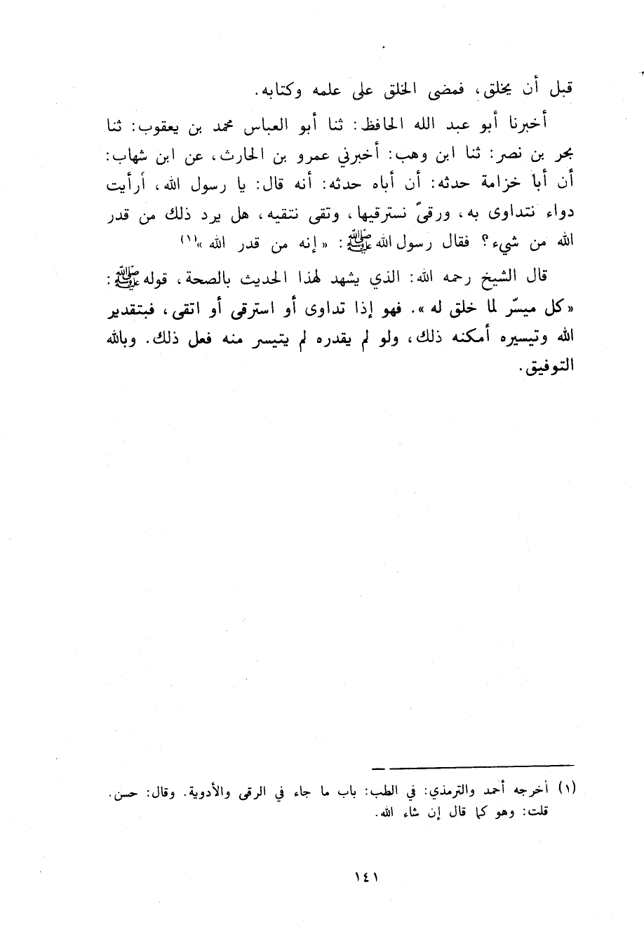 أَخْبَرَنَا أَبُو عَبْدِ اللَّهِ الْحَافِظُ، ثنا أَبُو الْعَبَّاسِ مُحَمَّدُ بْنُ يَعْقُوبَ، ثنا بَحْرُ بْنُ نَصْرٍ، ثنا ابْنُ وَهْبٍ، أَخْبَرَنِي عَمْرُو بْنُ الْحَارِثِ، عَنِ ابْنِ شِهَابٍ، أَنَّ أَبَا خُزَامَةَ حَدَّثَهُ أَنَّ أَبَاهُ حَدَّثَهُ أَنَّهُ قَالَ: يَا رَسُولَ اللَّهِ أَرَأَيْتَ دَوَاءً نَتَدَاوَى بِهِ وَرُقًى نَسْتَرْقِيهَا وَتُقًى نَتَّقِيهِ هَلْ يَرُدُّ ذَلِكَ مِنْ قَدَرِ اللَّهِ مِنْ شَيْءٍ؟ فَقَالَ رَسُولُ اللَّهِ صَلَّى اللهُ عَلَيْهِ وَسَلَّمَ: إِنَّهُ §مِنْ قَدَرِ اللَّهِ قَالَ الشَّيْخُ رَحِمَهُ اللَّهُ: وَالَّذِي يَشْهَدُ لِهَذَا الْحَدِيثِ بِالصِّحَّةِ قوْلُهُ صَلَّى اللهُ عَلَيْهِ وَسَلَّمَ «كُلٌّ مُيَسَّرٌ لِمَا خُلِقَ لَهُ» فَهُوَ إِذَا تَدَاوَى أَوِ اسْتَرْقَى أَوِ اتَّقَى فَبِتَقْدِيرِ اللَّهِ وَتَيْسِيرِهِ أَمْكَنَهُ ذَلِكَ، وَلَوْ لَمْ يُقَدِّرْهُ لَمْ يَتَيَسَّرْ مِنْهُ فِعْلُ ذَلِكَ، وَبِاللَّهِ التَّوْفِيقُ