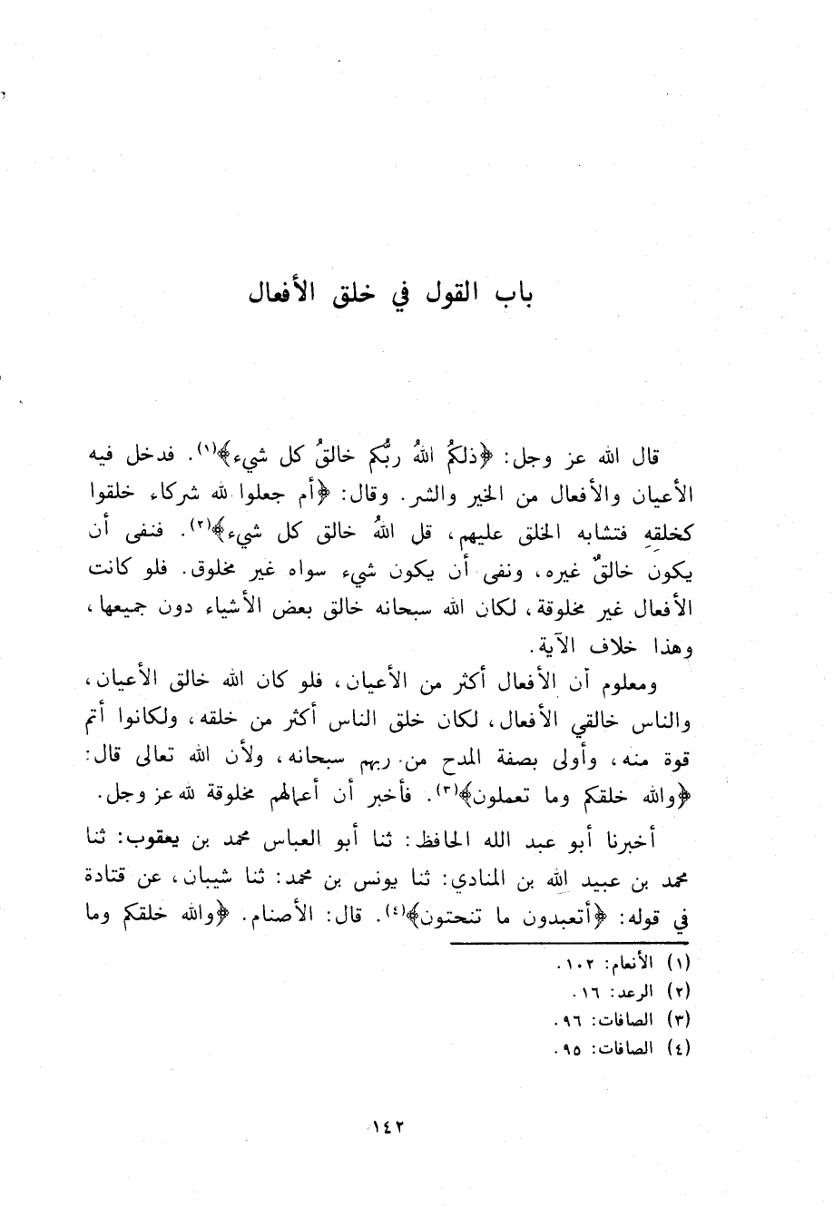 §بَابٌ الْقَوْلُ فِي خَلْقِ الْأَفْعَالِ قَالَ اللَّهُ عَزَّ وَجَلَّ {ذَلِكُمُ اللَّهُ رَبُّكُمْ خَالِقُ كُلِّ شَيْءٍ} [غافر: 62] فَدَخَلَ فِيهِ الْأَعْيَانُ وَالْأَفْعَالُ مِنَ الْخَيْرِ وَالشَّرِّ، وَقَالَ: {أَمْ جَعَلُوا لِلَّهِ شُرَكَاءَ خَلَقُوا كَخَلْقِهِ فَتَشَابَهَ الْخَلْقُ عَلَيْهِمْ قُلِ اللَّهُ خَالِقُ كُلِّ شَيْءٍ} [الرعد: 16] فَنَفَى أَنْ يَكُونَ خَالِقٌ غَيْرَهُ وَنَفَى أَنْ يَكُونَ شَيْءٌ سِوَاهُ غَيْرَ مَخْلُوقٍ، فَلَوْ كَانَتِ الْأَفْعَالُ غَيْرَ مَخْلُوقَةٍ لَكَانَ اللَّهُ سُبْحَانَهُ خَالِقَ بَعْضِ الْأَشْيَاءِ دُونَ جَمِيعِهَا، وَهَذَا خِلَافُ الْآيَةِ، وَمَعْلُومٌ أَنَّ الْأَفْعَالَ أَكْثَرُ مِنَ الْأَعْيَانِ فَلَوْ كَانَ اللَّهُ خَالِقَ الْأَعْيَانِ وَالنَّاسُ خَالِقِي الْأَفْعَالِ لَكَانَ خَلْقُ النَّاسِ أَكْثَرَ مِنْ خَلْقِهِ وَلَكَانُوا أَتَمَّ قُوَّةً مِنْهُ وَأَوْلَى بِصِفَةِ الْمَدْحِ مِنْ رَبِّهِمْ سُبْحَانَهُ؛ وَلَأَنَّ اللَّهَ تَعَالَى قَالَ: {وَاللَّهُ خَلَقَكُمْ وَمَا تَعْمَلُونَ} [الصافات: 96] فَأَخْبَرَ أَنَّ أَعْمَالَهُمْ مَخْلُوقَةٌ لِلَّهِ عَزَّ وَجَلَّ