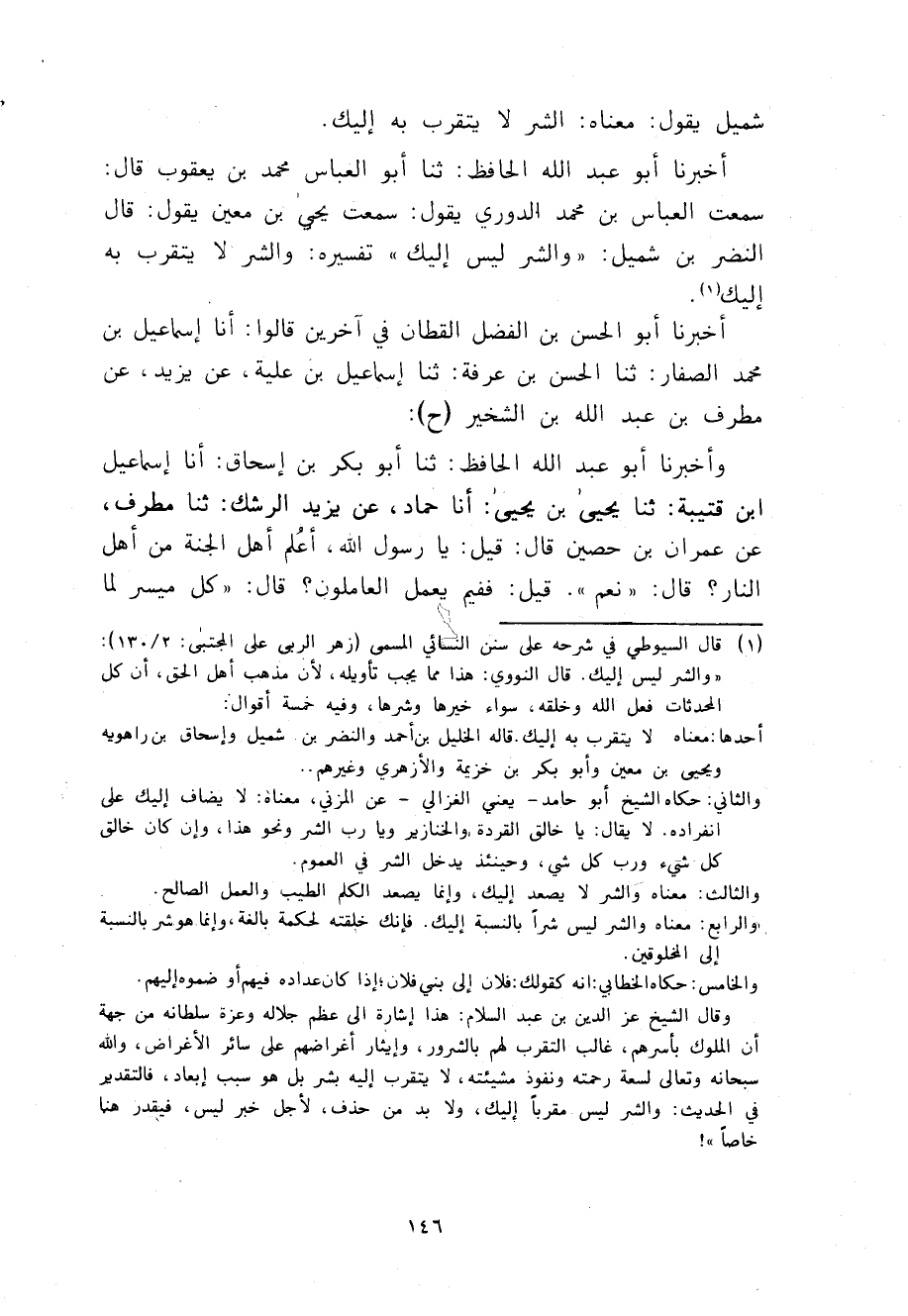 أَخْبَرَنَا أَبُو عَبْدِ اللَّهِ الْحَافِظُ، ثنا أَبُو الْعَبَّاسِ مُحَمَّدُ بْنُ يَعْقُوبَ قَالَ: سَمِعْتُ الْعَبَّاسَ بْنَ مُحَمَّدٍ الدُّورِيَّ يَقُولُ: سَمِعْتُ يَحْيَى بْنَ مَعِينٍ يَقُولُ: قَالَ النَّضْرُ بْنُ شُمَيْلٍ: «§وَالشَّرُّ لَيْسَ إِلَيْكَ» تَفْسِيرُهُ: وَالشَّرُّ لَا يُتَقَرَّبُ بِهِ إِلَيْكَ