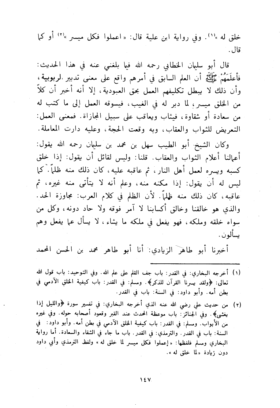 أَخْبَرَنَا أَبُو طَاهِرٍ مُحَمَّدُ بْنُ مُحَمَّدِ بْنِ مَحْمِشٍ الْفَقِيهُ الزِّيَادِيُّ، أنا أَبُو طَاهِرٍ مُحَمَّدُ بْنُ الْحَسَنِ الْمُحَمَّدَابَاذِيُّ -[148]-، ثنا أَبُو قِلَابَةَ، ثنا عُثْمَانُ بْنُ عُمَرَ، (ح) وَأَخْبَرَنَا مُحَمَّدُ بْنُ عَبْدِ اللَّهِ الْحَافِظُ، أنا مُحَمَّدُ بْنُ يَعْقُوبَ الشَّيْبَانِيُّ، ثنا مُحَمَّدُ بْنُ شَاذَانَ، ثنا إِسْحَاقُ بْنُ إِبْرَاهِيمَ، أنا عُثْمَانُ بْنُ عُمَرَ، أنا عَزْرَةُ بْنُ ثَابِتٍ، عَنْ يَحْيَى بْنِ عَقِيلٍ، عَنْ يَحْيَى بْنِ يَعْمَرَ، عَنْ أَبِي الْأَسْوَدِ الدَّيْلِيِّ، قَالَ: قَالَ لِي عِمْرَانُ بْنُ حُصَيْنٍ: أَرَأَيْتَ مَا يَعْمَلُ النَّاسُ الْيَوْمَ وَيَكْدَحُونَ فِيهِ، أَشَيْءٌ قُضِيَ عَلَيْهِمْ وَمَضَى عَلَيْهِمْ مِنْ قَدَرٍ قَدْ سَبَقَ أَوْ فِيمَا يَسْتَقْبِلُونَهُ مِمَّا أَتَاهُمْ بِهِ نَبِيُّهُمْ صَلَّى اللهُ عَلَيْهِ وَسَلَّمَ وَثَبَتَتِ الْحُجَّةُ عَلَيْهِمْ؟ فَقُلْتُ: بَلْ شَيْءٌ قُضِيَ عَلَيْهِمْ وَمَضَى عَلَيْهِمْ، قَالَ: فَقَالَ أَفَلَا يَكُونُ ظُلْمًا؟ قَالَ فَفَزِعْتُ مِنْ ذَلِكَ فَزَعًا شَدِيدًا وَقُلْتُ: كُلُّ شَيْءٍ خَلْقُ اللَّهِ وَمِلْكُ يَدِهِ فَلَا يُسْأَلُ عَمَّا يَفْعَلُ وَهُمْ يُسْأَلُونَ، فَقَالَ لِي: يَرْحَمُكَ اللَّهُ إِنِّي لَمْ أُرِدْ بِمَا سَأَلْتُكَ عَنْهُ إِلَّا لِأُحْرِزَ عَقْلَكَ، إِنَّ رَجُلَيْنِ مِنْ مُزَيْنَةَ أَتَيَا رَسُولَ اللَّهِ صَلَّى اللهُ عَلَيْهِ وَسَلَّمَ فَقَالَا: يَا رَسُولَ اللَّهِ أَرَأَيْتَ مَا يَعْمَلُ النَّاسُ الْيَوْمَ وَيَكْدَحُونَ فِيهِ أَشَيْءٌ قُضِيَ عَلَيْهِمْ وَمَضَى فَيهِمْ مِنْ قَدَرٍ قَدْ سَبَقَ أَوْ فِيمَا يَسْتَقْبِلُونَهُ بِهِ مِمَّا أَتَاهُمْ بِهِ نَبِيُّهُمْ صَلَّى اللهُ عَلَيْهِ وَسَلَّمَ وَثَبَتَتَ عَلَيْهِمُ الْحُجَّةُ؟ فَقَالَ: لَا، بَلْ شَيْءٌ قُضِيَ عَلَيْهِمْ وَمَضَى فَيهِمْ، قَالَ: فَفِيمَ نَعْمَلُ إِذًا؟ قَالَ: §مَنْ كَانَ اللَّهُ خَلَقَهُ لِوَاحِدَةٍ مِنَ الْمَنْزِلَتَيْنِ يَسَّرَهُ لَهَا، وَتَصْدِيقُ ذَلِكَ فِي كِتَابِ اللَّهِ {وَنَفْسٍ وَمَا سَوَّاهَا فَأَلْهَمَهَا فُجُورَهَا وَتَقْوَاهَا} [الشمس: 7]
